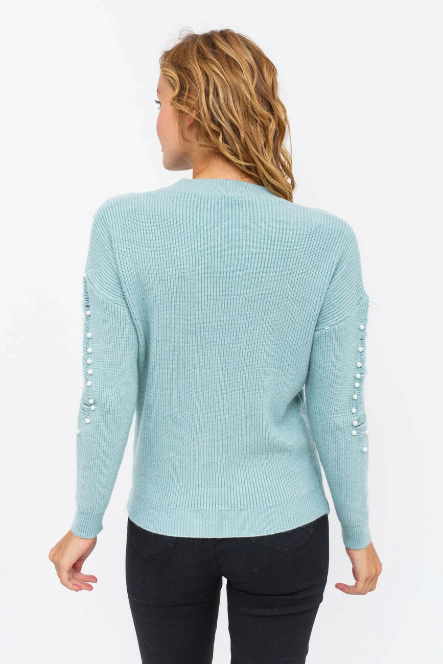 Стильный джемпер выполнен из качественного мягкого материала. Рукава с манжетами украшены жемчугом и стильным рваными порезами.