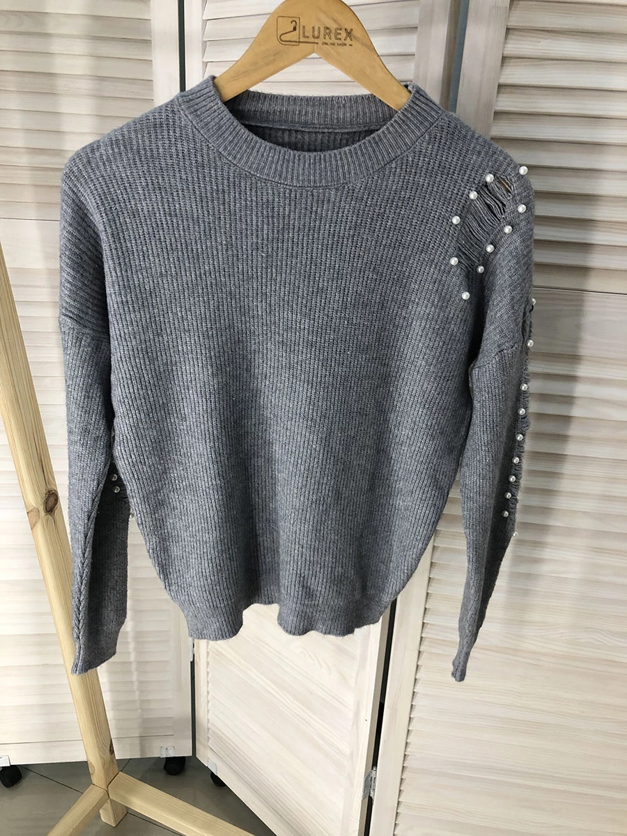 Стильный джемпер выполнен из качественного мягкого материала. Рукава с манжетами украшены жемчугом и стильным рваными порезами.