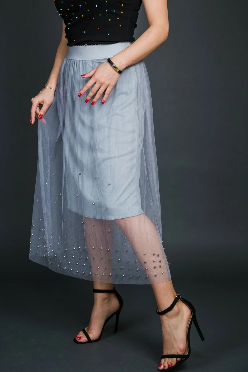 верхний слой из фатина, низ которого расшит серебрянными бусинами.