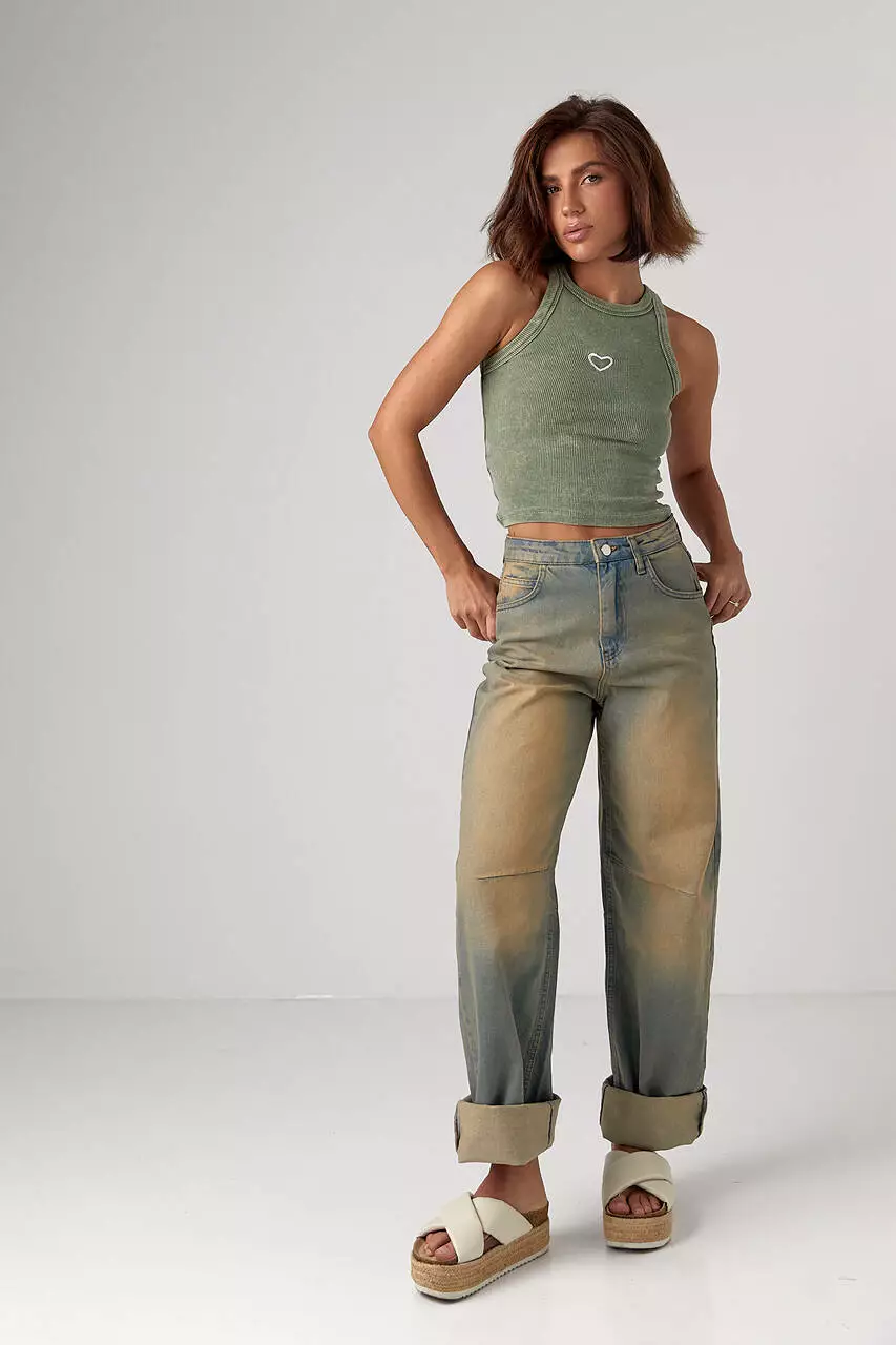Майка в рубчик тай-дай с вышитым сердцем - хаки цвет, M (есть размеры)
