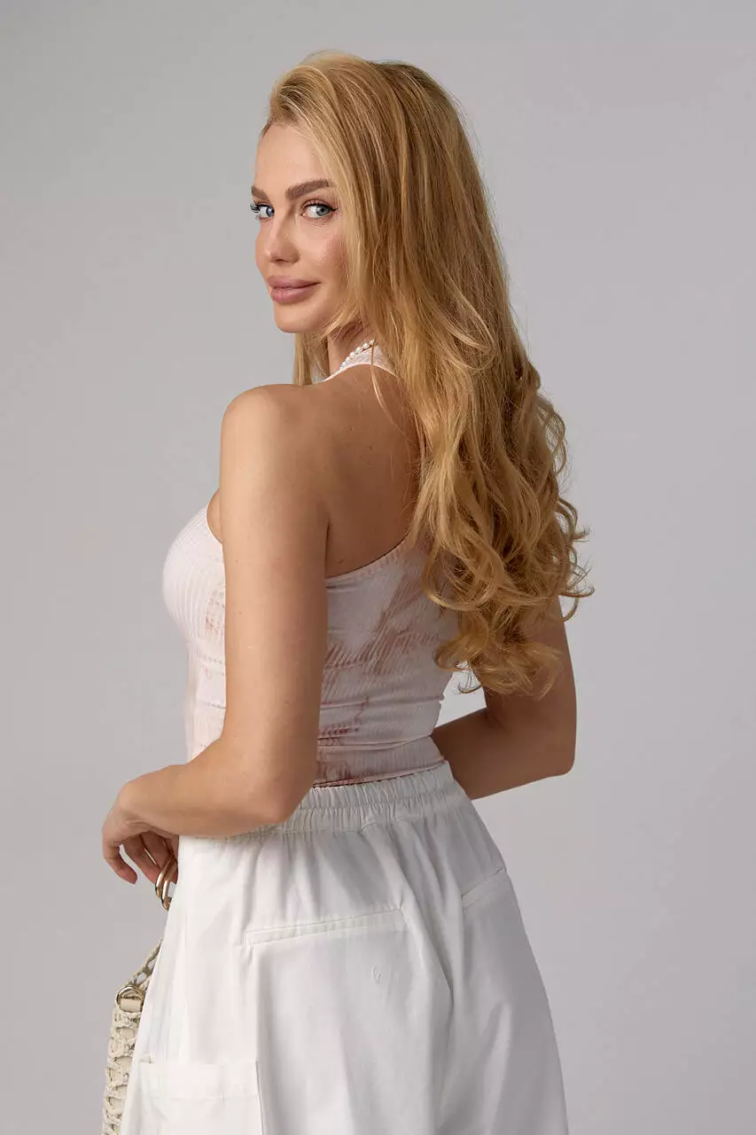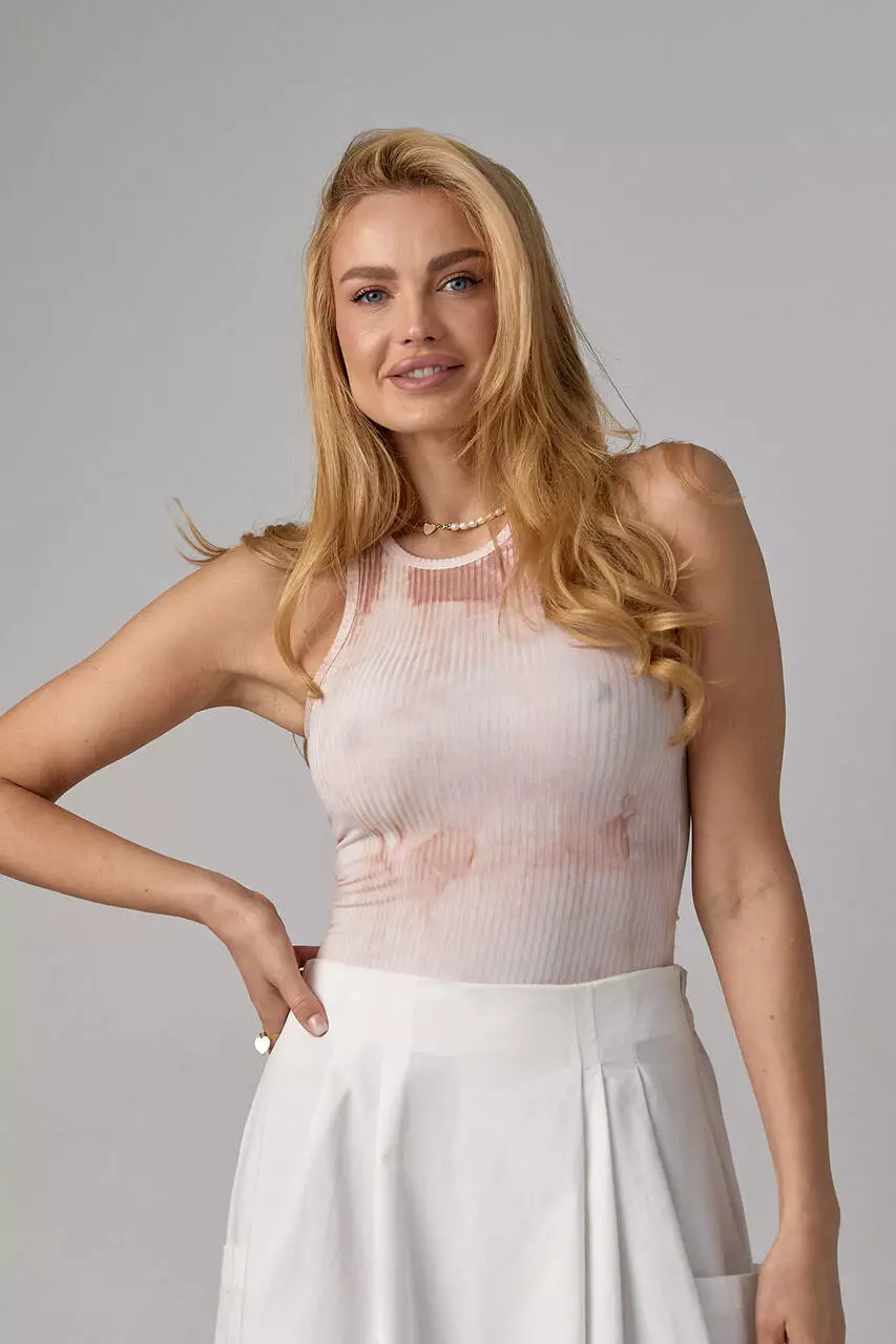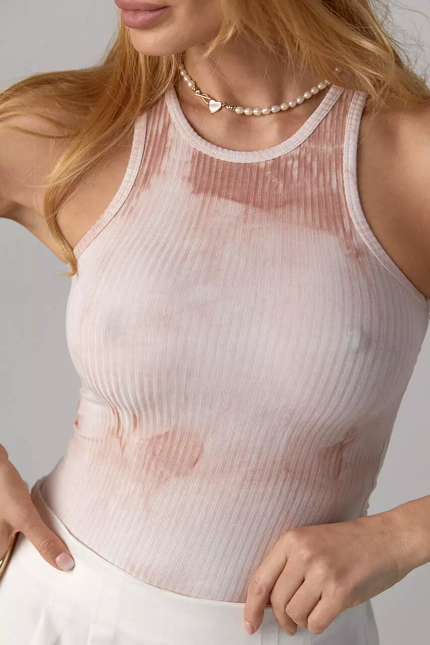 Эта женская трикотажная майка в рубчик создана для комфортного повседневного использования. Она выполнена в технике тай-дай, которая придает ей уникальный и стильный внешний вид. Майка обладает приятной текстурой и отличной эластичностью, обеспечивая свободу движений.