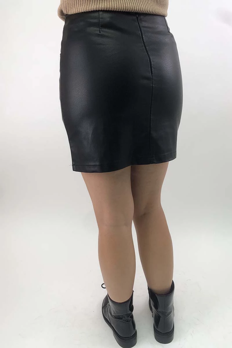 Кожаная мини-юбка с декоративными серебристыми большими пуговицами изготовлена из мягкой и толстой экокожи на трикотажной основе. Юбка имеет врезные карманы на передней части изделия и застегивается сзади на молнию, Украшает изделдие декоративная двойная прострочка.