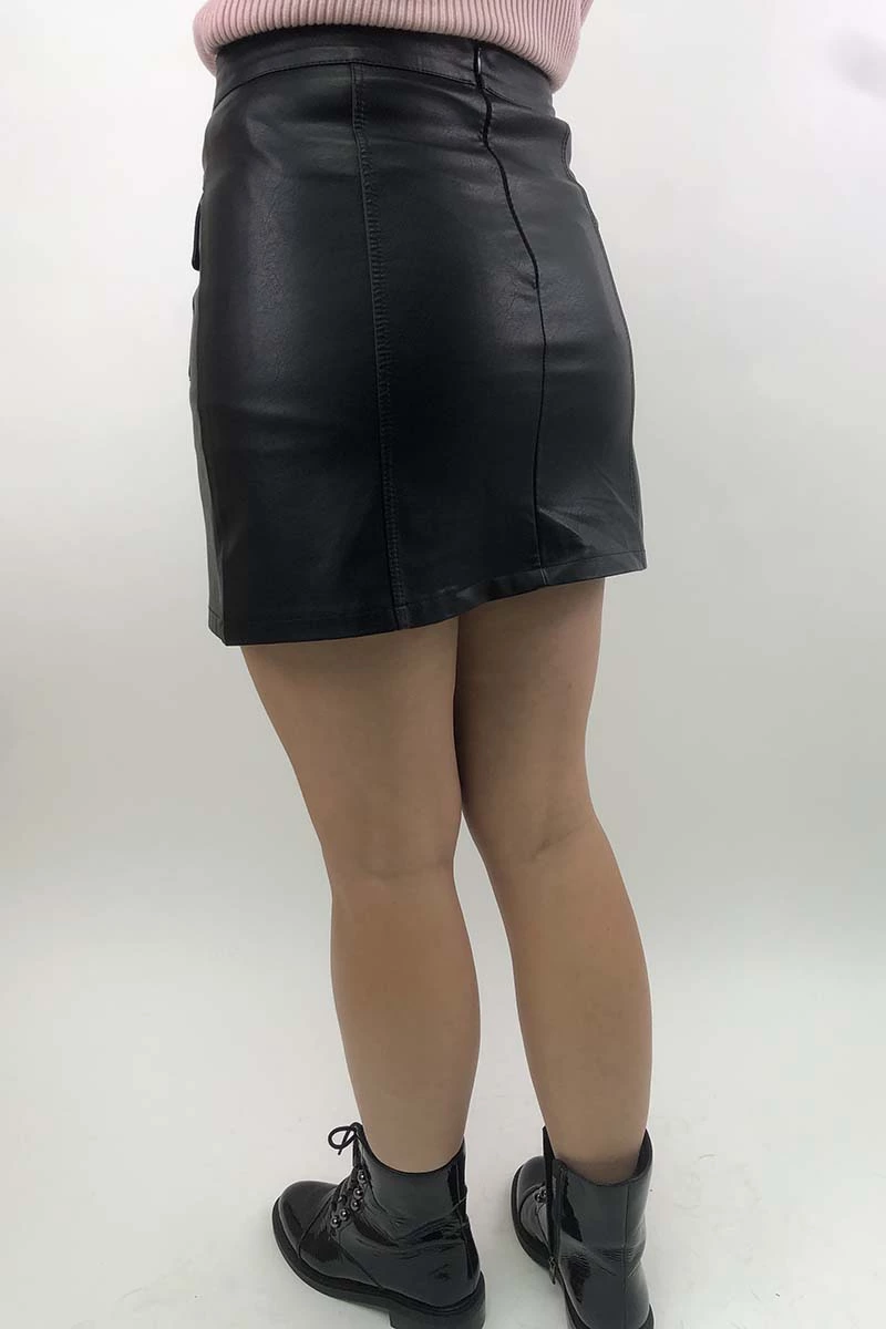 Модная кожаная мини-юбка с большими накладными карманами и прямыми