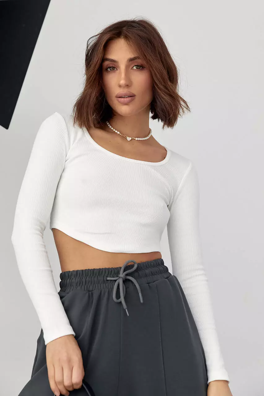 Модель идет с полукруглым низом, длинными рукавами и круглым