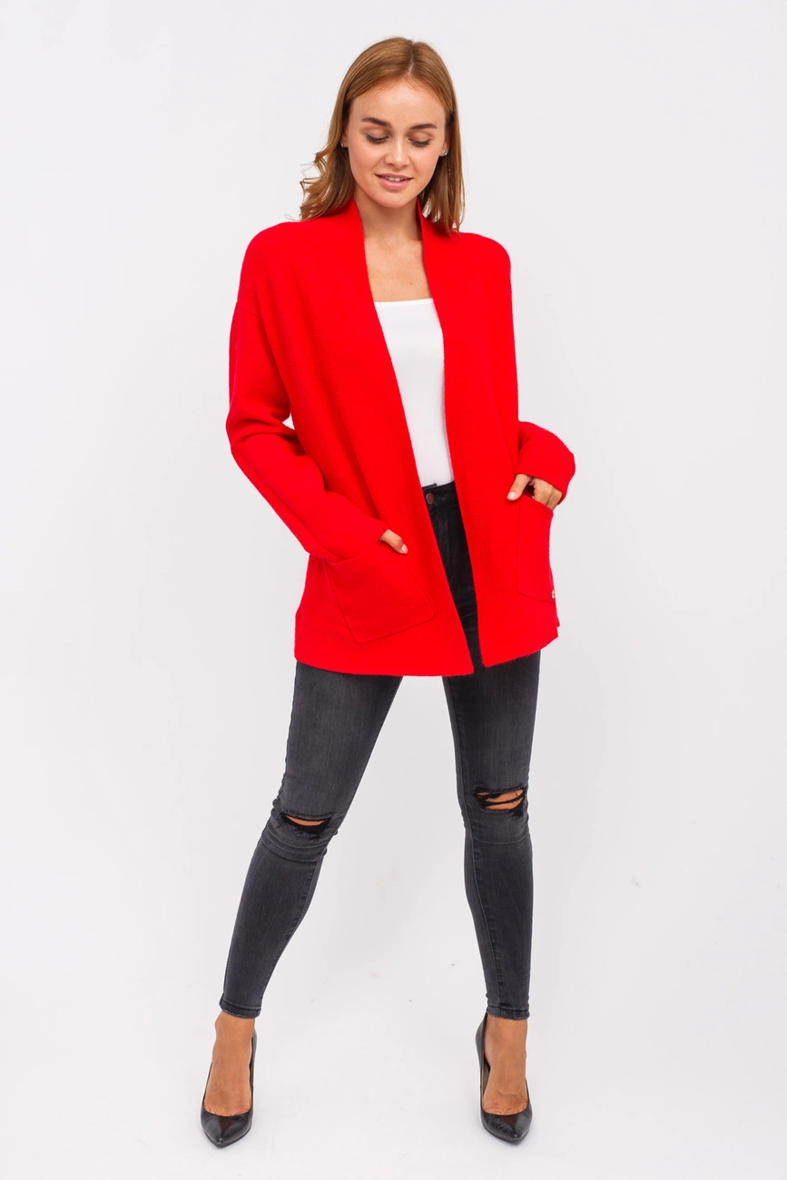Открытый женский кардиган отличный вариант для прохладной погоды. Спереди есть два кармана, на одном кармашке есть маленькое украшение.