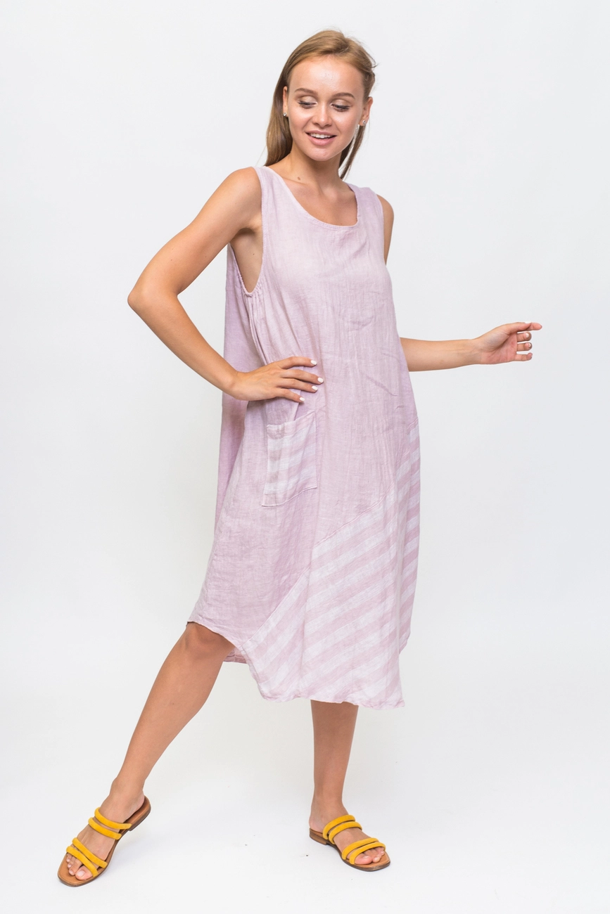 Свободное летнее платье из натурального материала. Платье однотонное, но внизу есть полосатая вставочка, что придает изделию оригинальности.