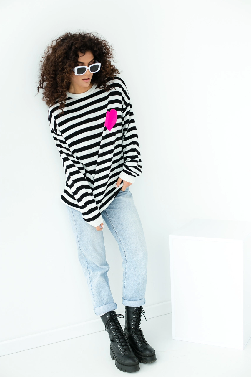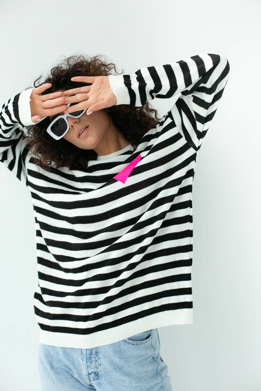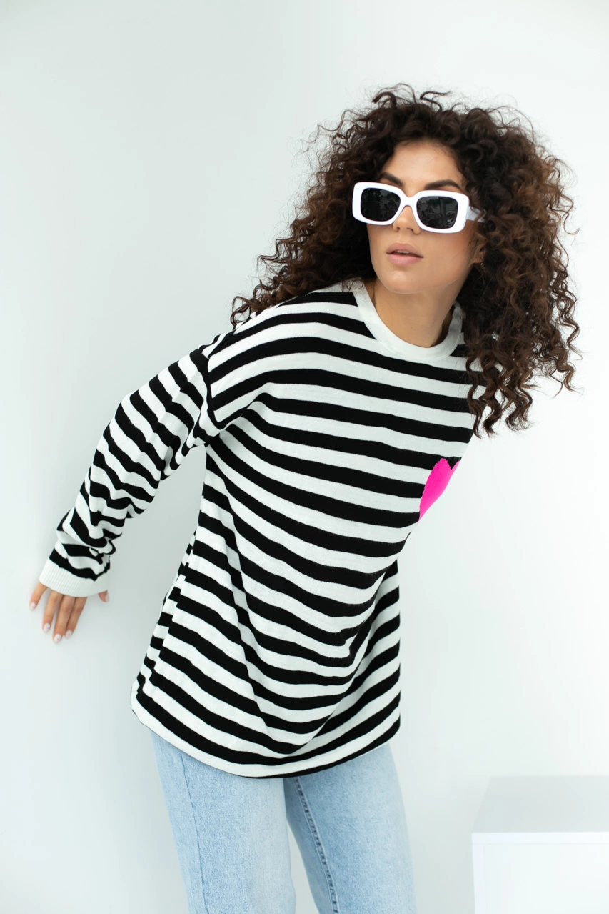Стильный свитшот в полоску свободного фасона выполнен из мягкой