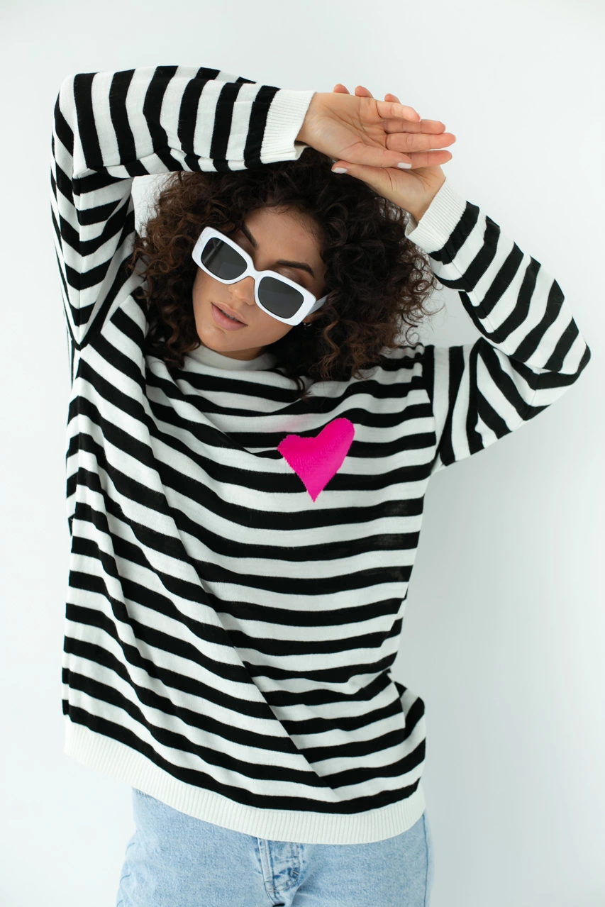 Стильный свитшот в полоску свободного фасона выполнен из мягкой
