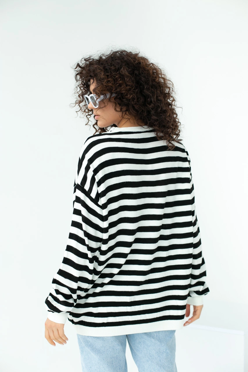 Стильный свитшот в полоску свободного фасона выполнен из мягкой