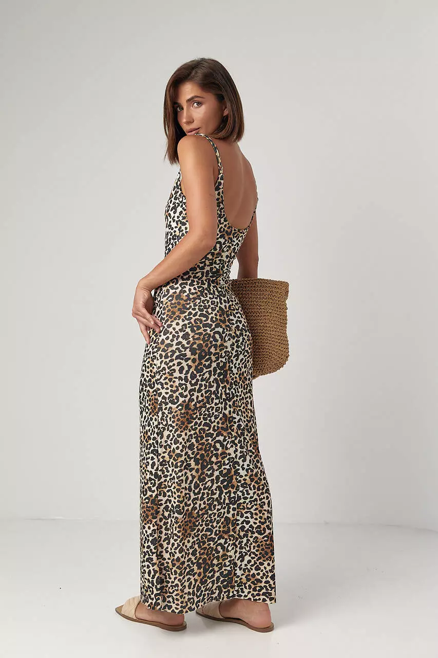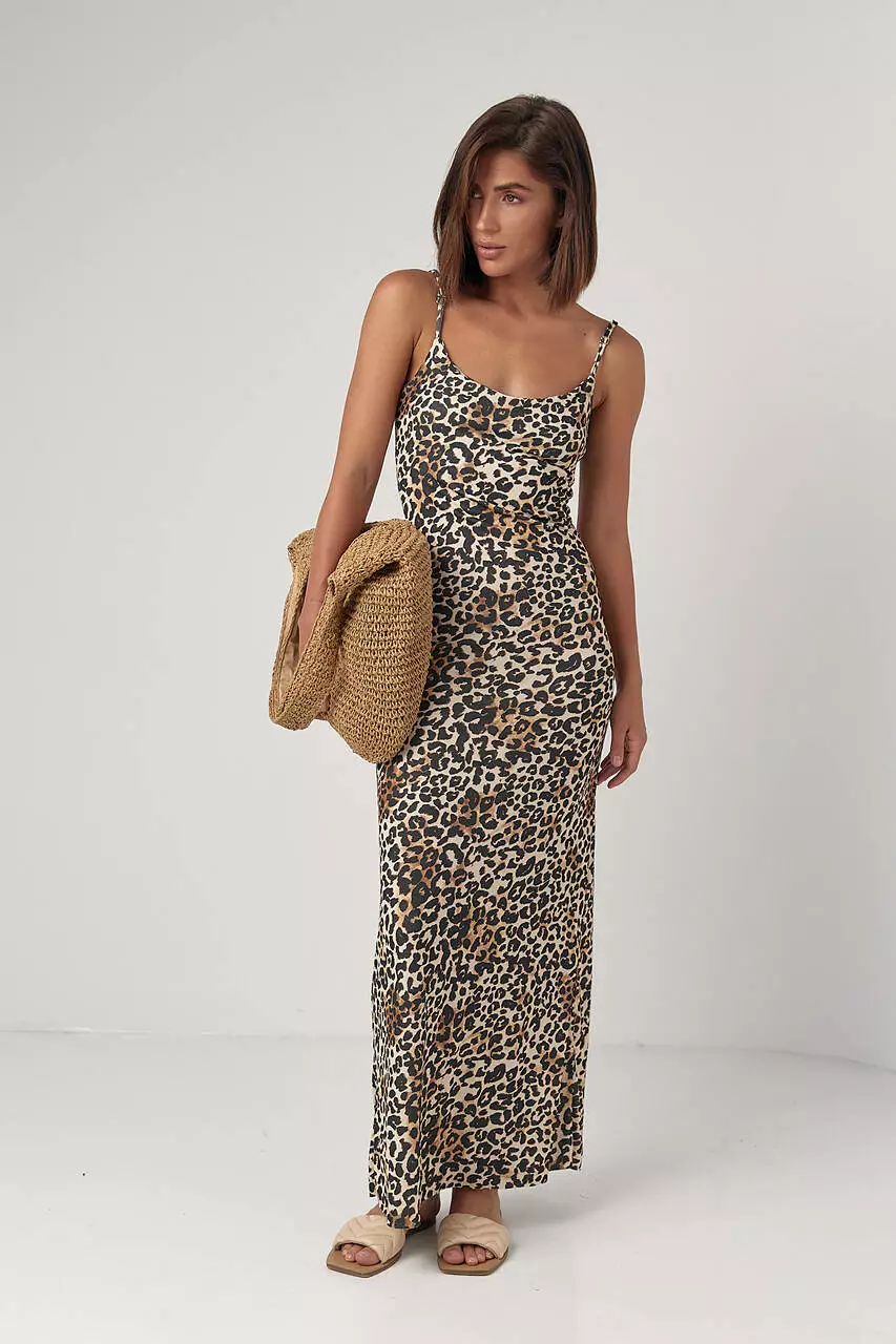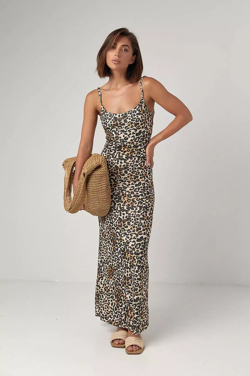Этот женский сарафан из трикотажа — воплощение элегантности и женственности. Его силуэтный фасон придает образу изысканности и утонченности, а леопардовый узор добавляет ему дерзости и смелости.
