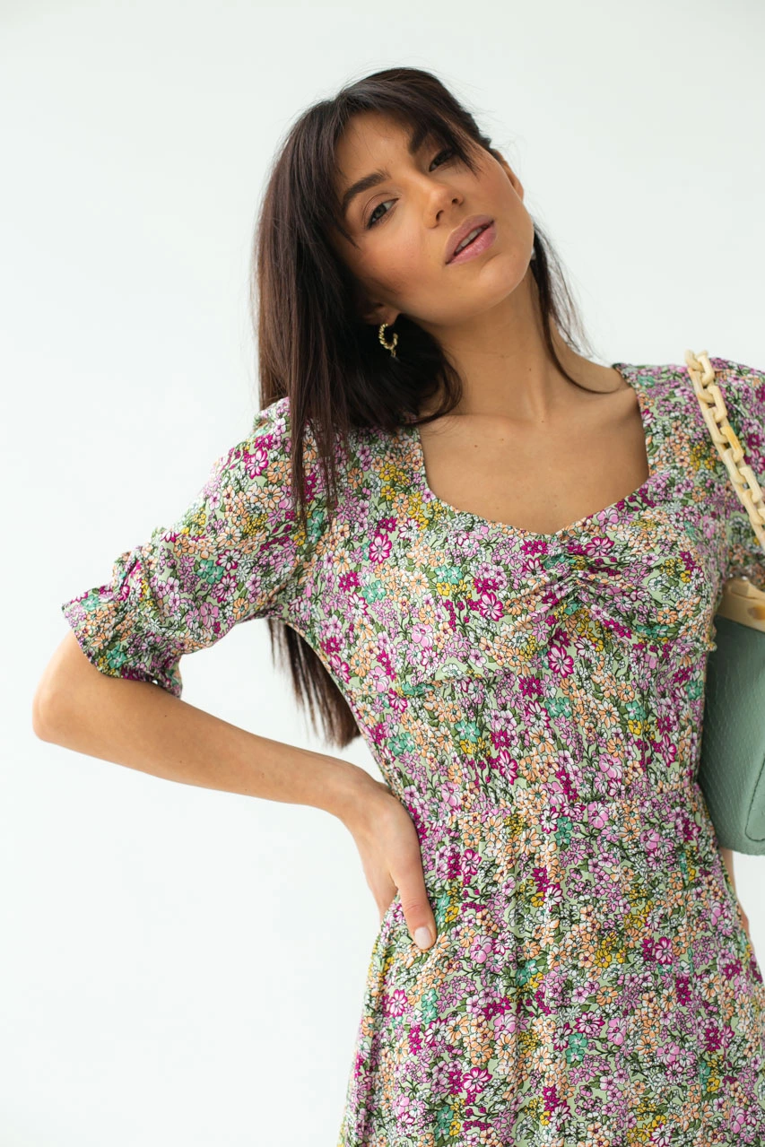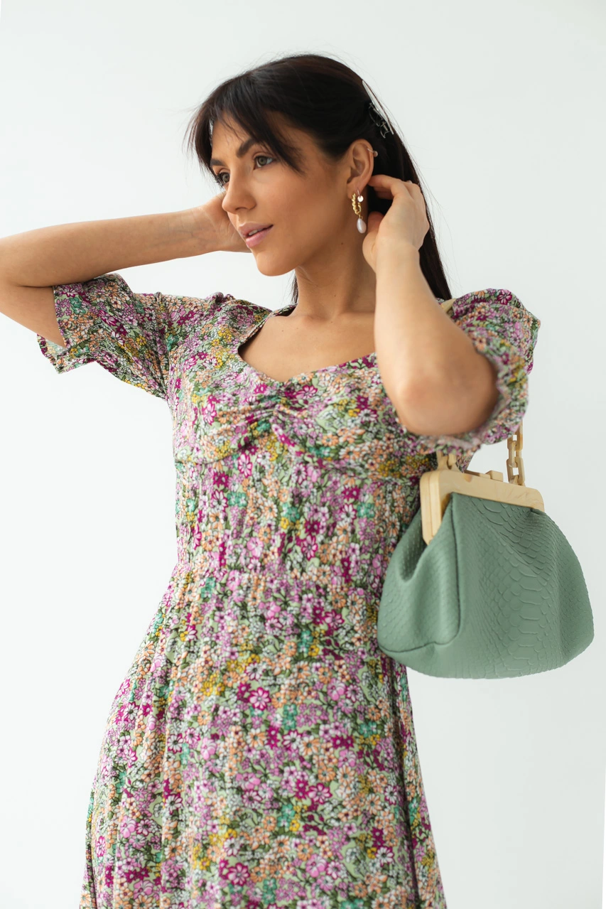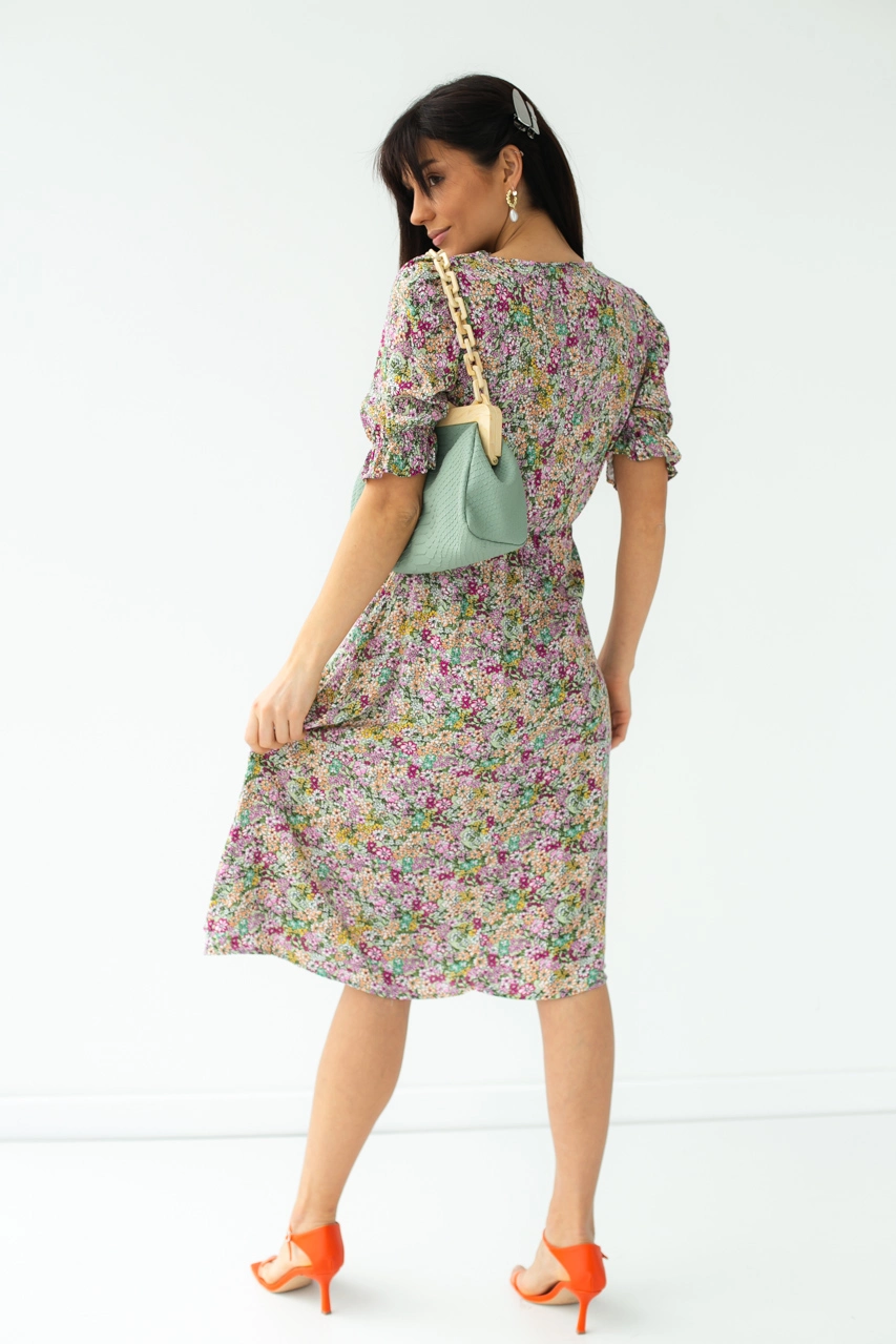 припосажен в нежную складку, рукава-фонарики с резинками по низу и