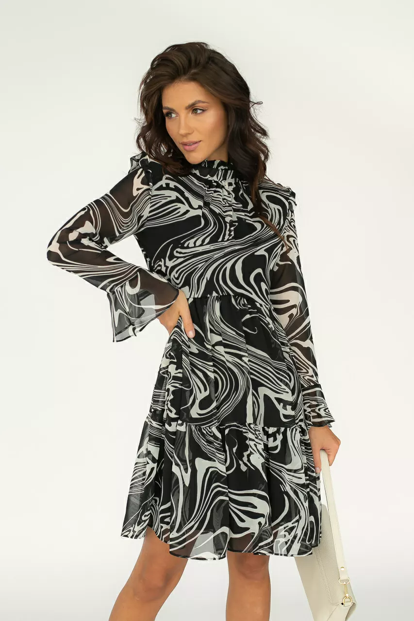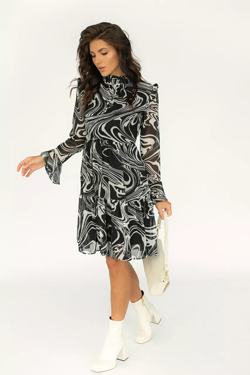 Шифоновое платья с рюшами и воротником-стойкой дополнит множество образов. Его можно надеть на официальное мероприятие вместе с жакетом, семейный ужин или свидание. Платье имеет оригинальный крой с рюшами, вшитыми в проймы рукавов и на воротнике-стойке.