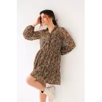 Мелкий цветочный принт и отделка из рюш — неотъемлемые элементы романтического стиля. Платье не просвечивается, так как внутри имеет трикотажную комбинацию на тонких бретелях. Отрезная широкая юбка собрана по верхнему краю, а снизу украшена широкой рюшей.