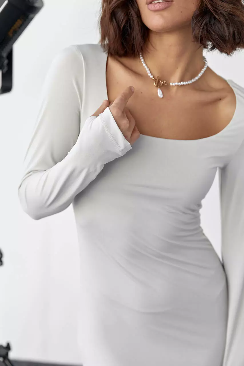 В модели длинные рукава, вырез горловины квадратный, а края низа