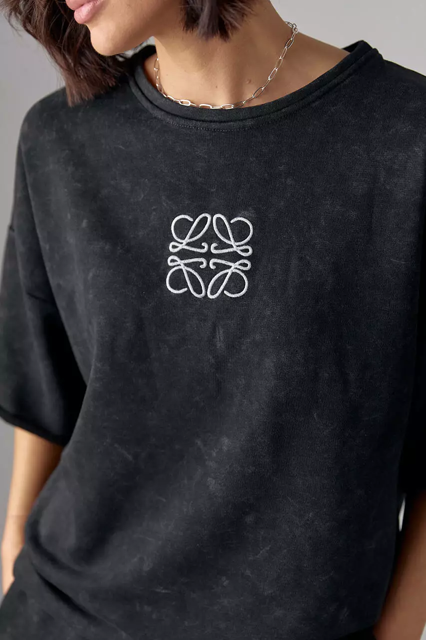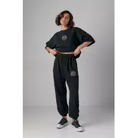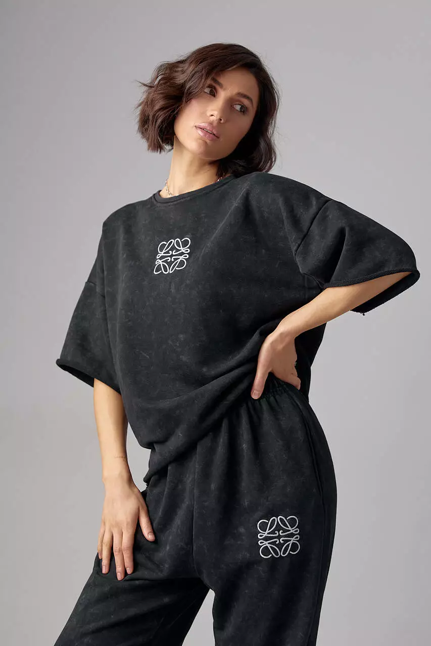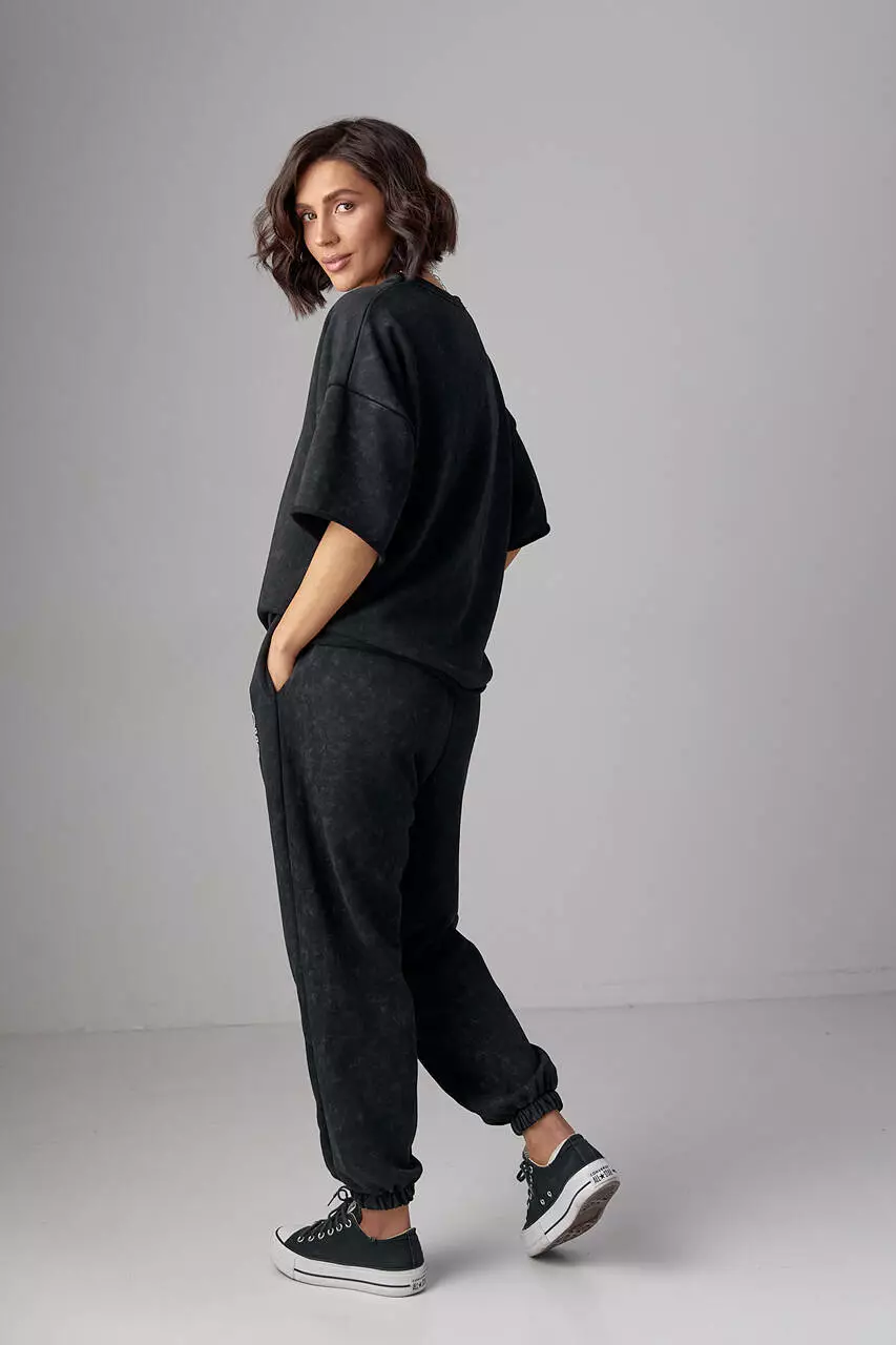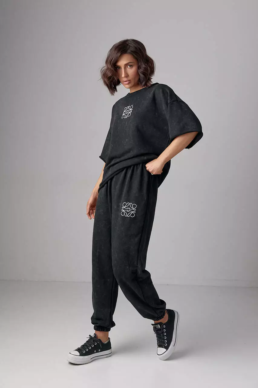 В этом комплекте свитшот в стиле оверсайз украшен спереди лаконичной вышивкой. В изделии края низа прямые, без манжетов.