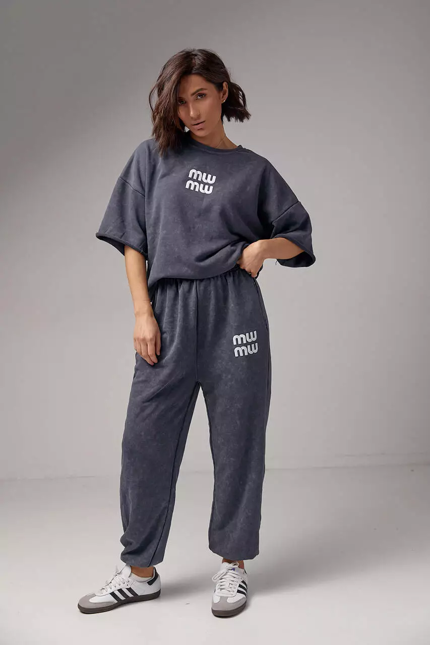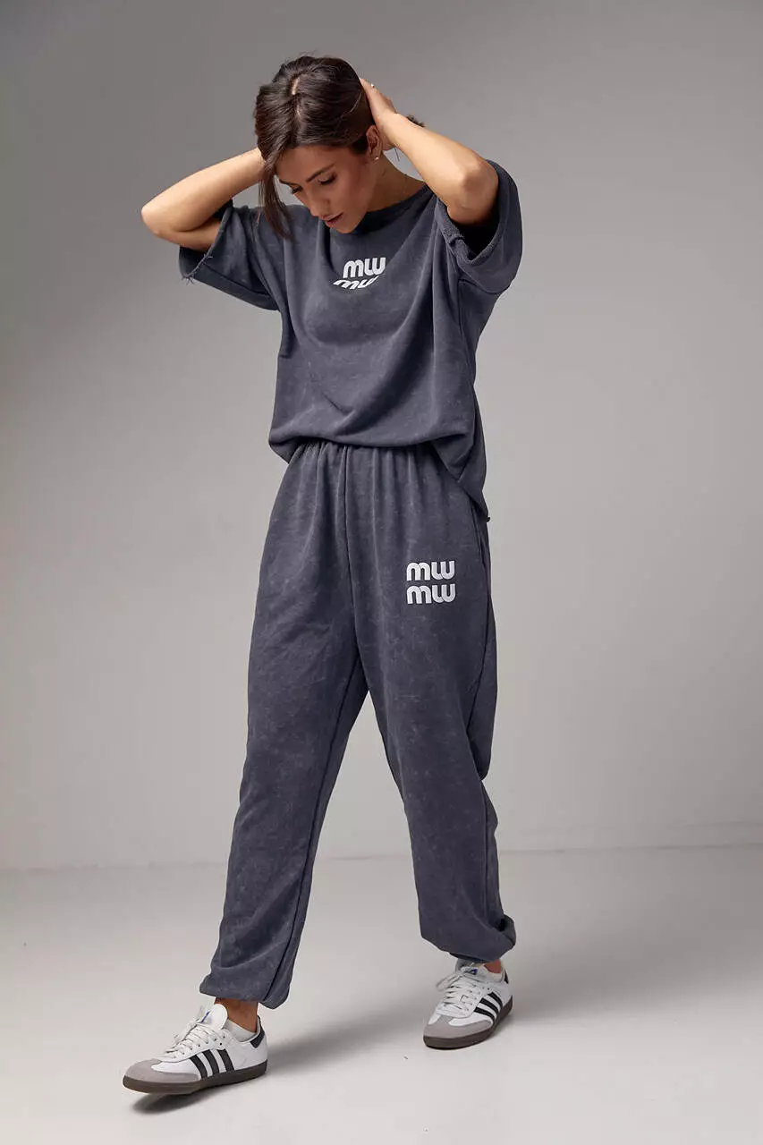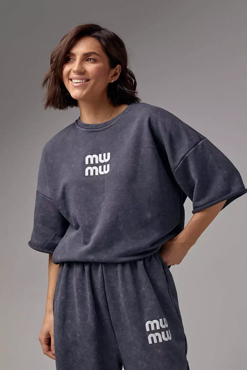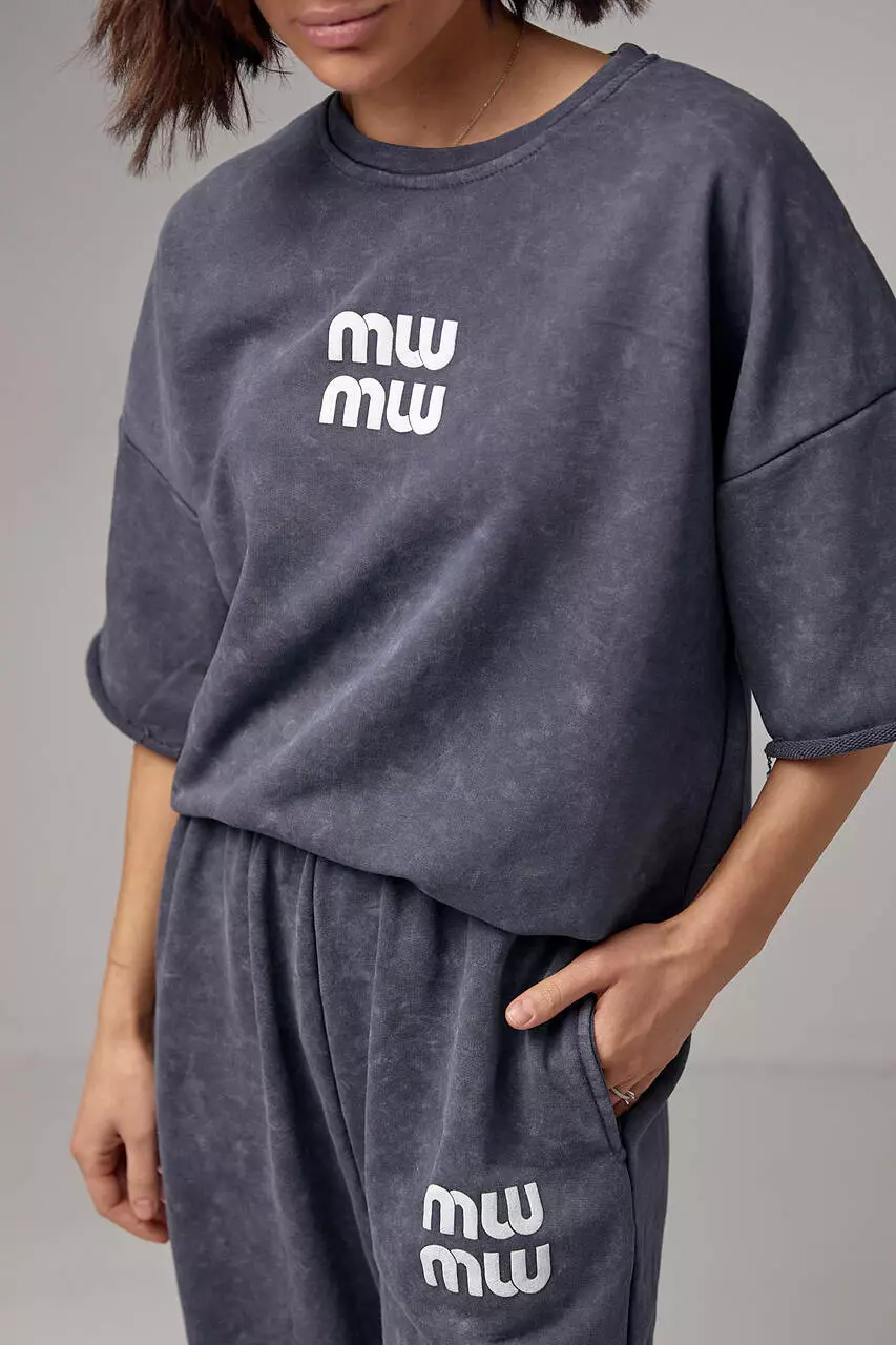 В этом комплекте свитшот в стиле оверсайз украшен спереди надписью "Miu Miu". В изделии края низа прямые, не обработаны. Проймы опущены, а четвертные рукава также имеют необработанный край.
