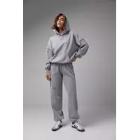 В комплект входит худи и джоггеры из трикотажа. В поясе штанов вшита широкая резинка с завязками, низ также собран на резинку. В боковых швах вверху расположены удобные прорезные кармашки.