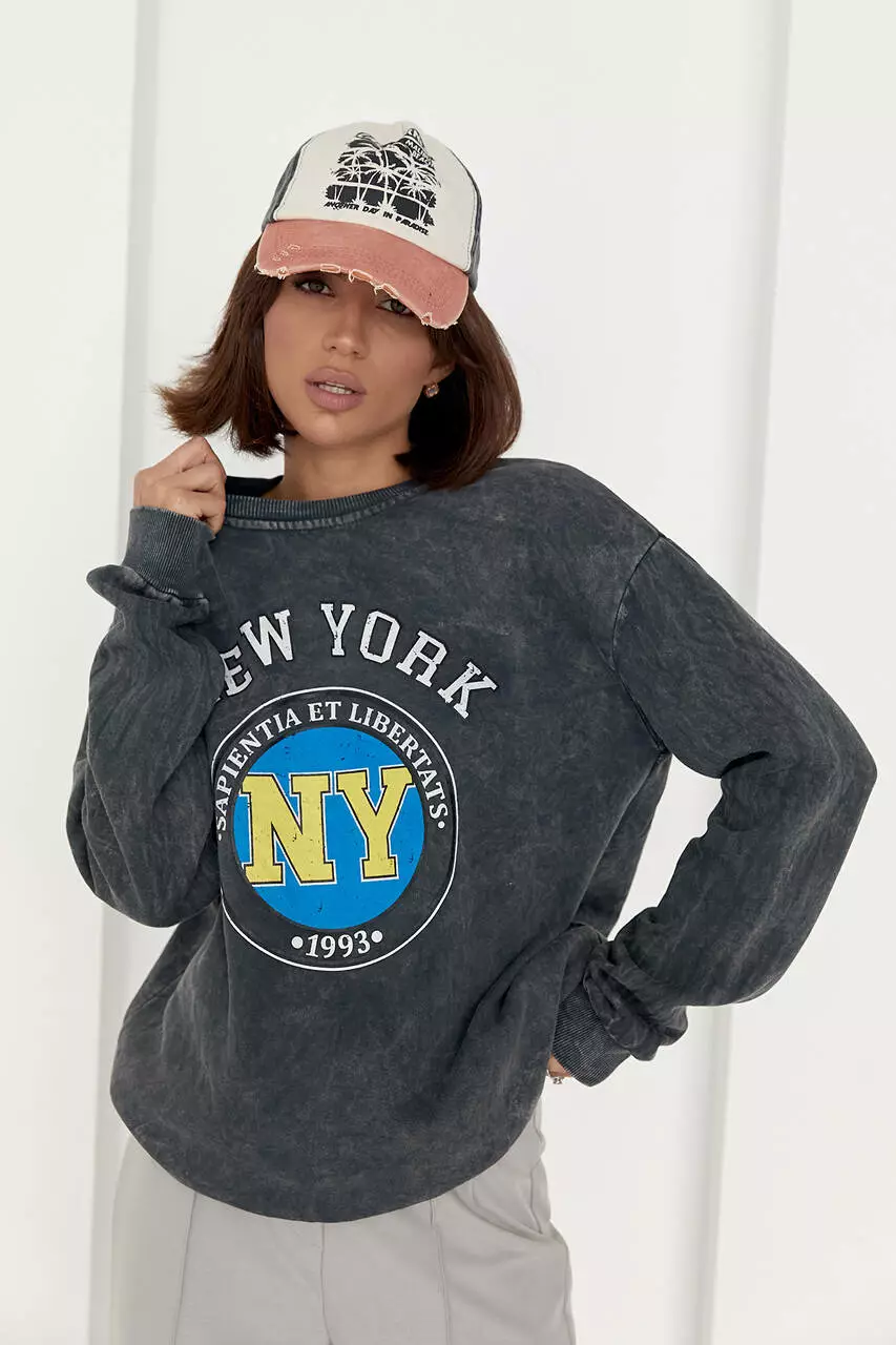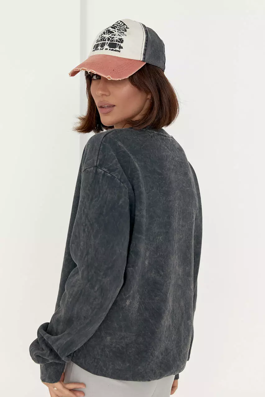 Изделие пошито из хлопковой ткани с начесом с эффектом тай-дай. В модели прямой низ и длинные рукава заканчиваются трикотажными манжетами.