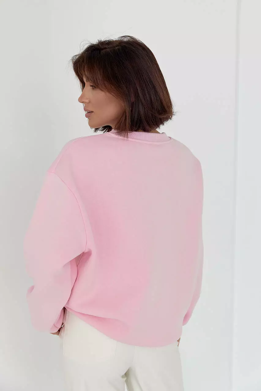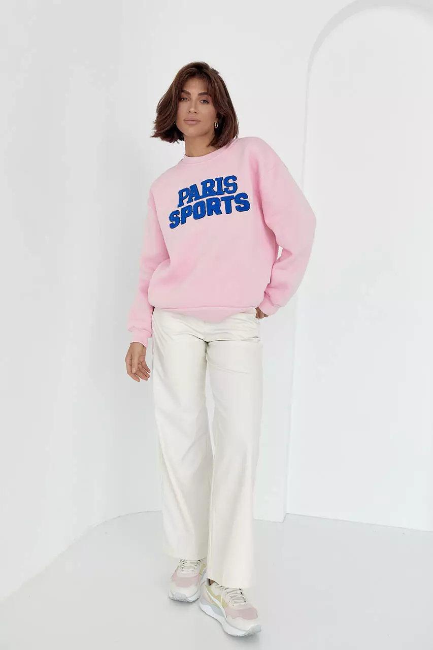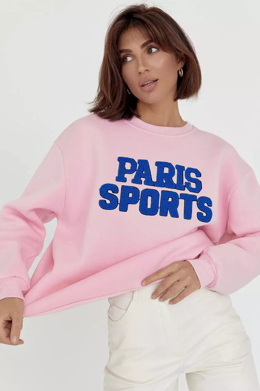 низ обшиты окантовкой в виде резинки. Спереди свитшот украшает