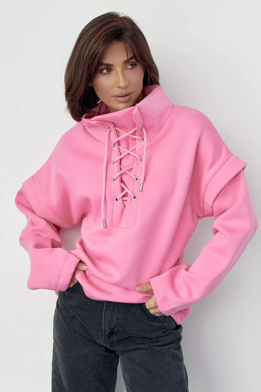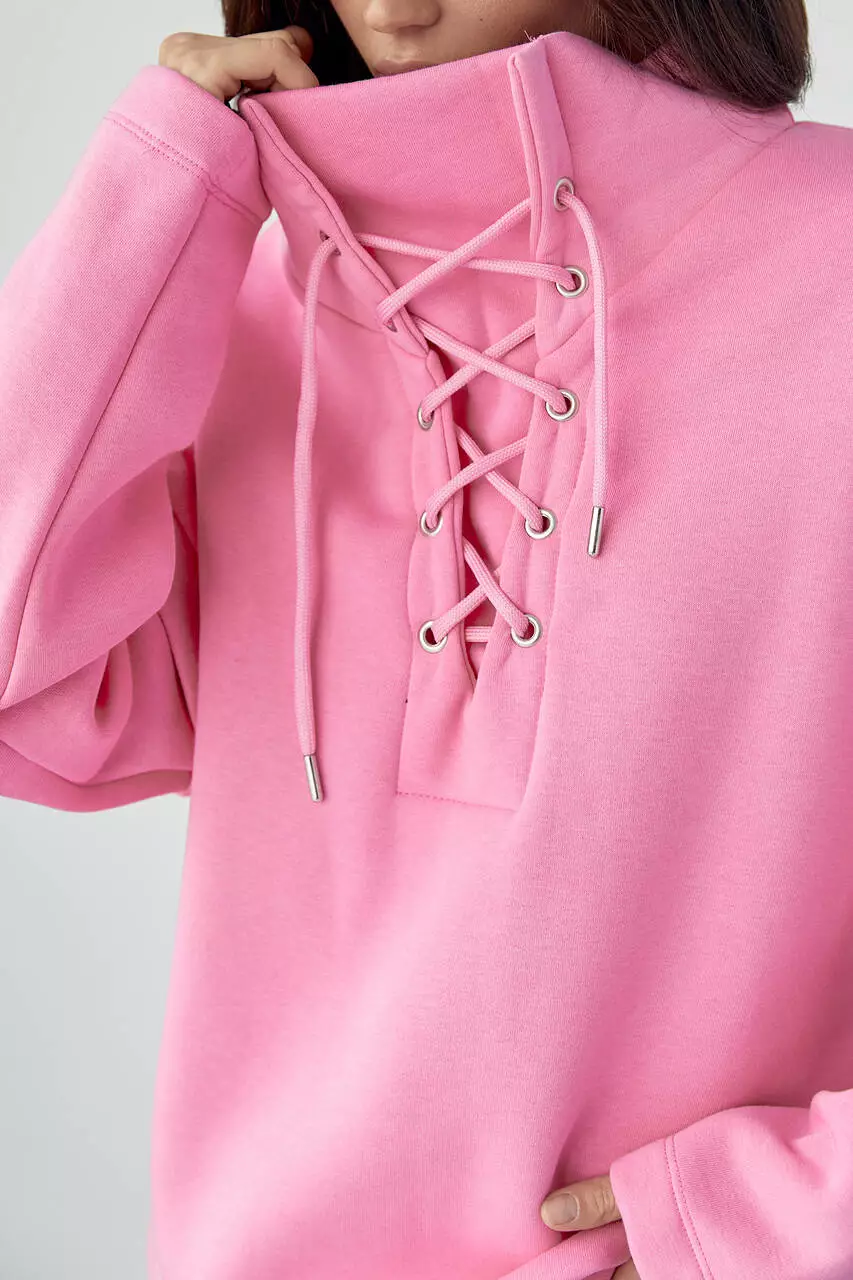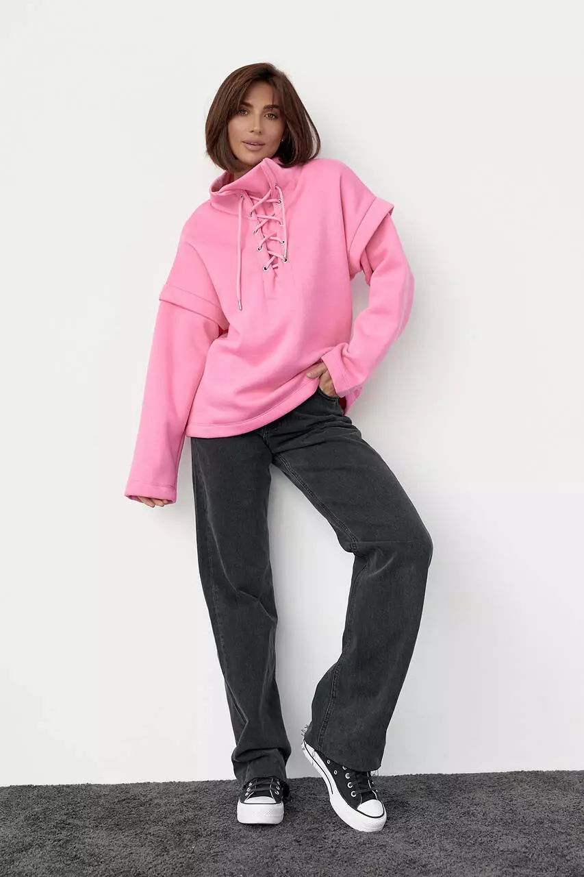 Модель из трикотажа с начесом идет с высокой горловиной, которая украшена шнуровкой. Линия плеча в изделии удлиненная, длинные рукава и прямой низ обшиты манжетами из основной ткани.