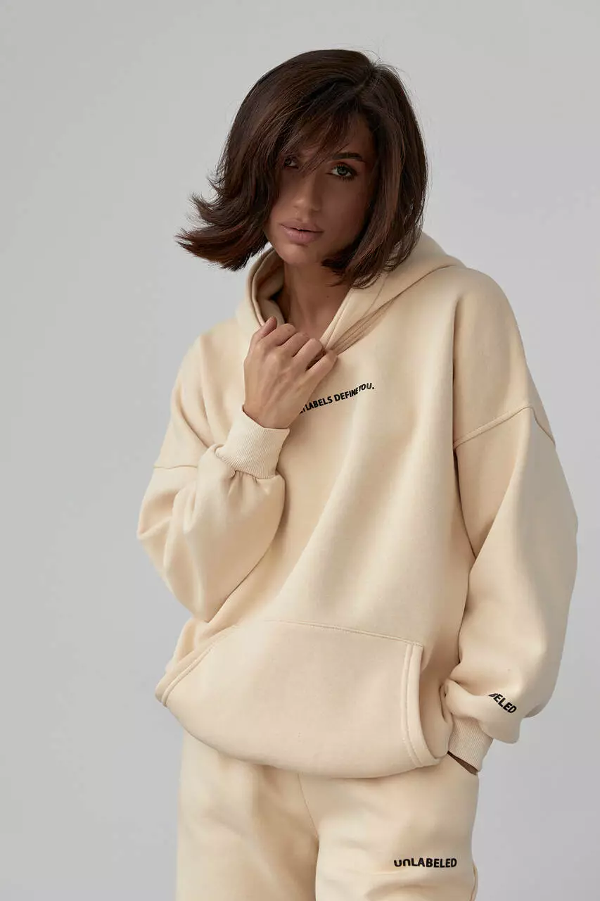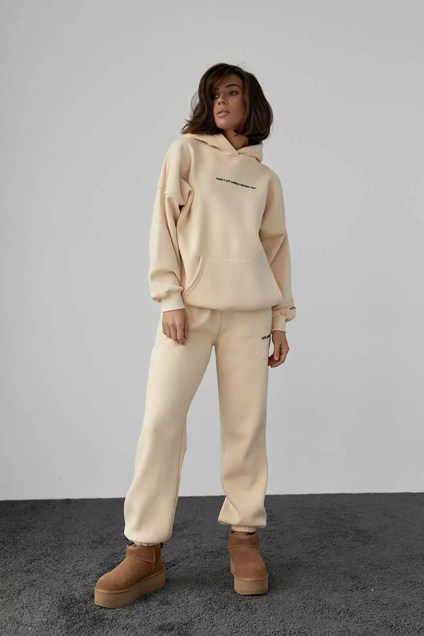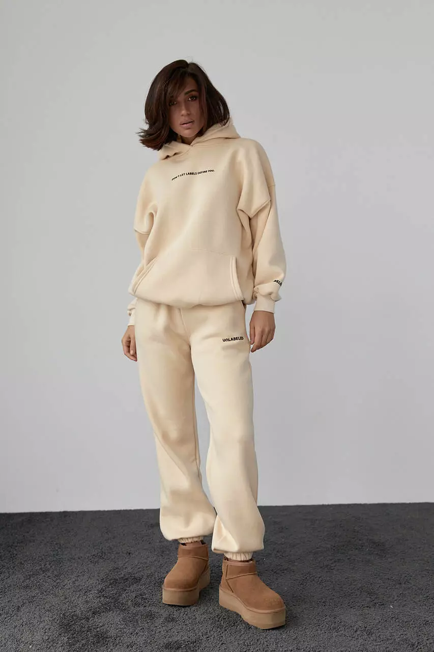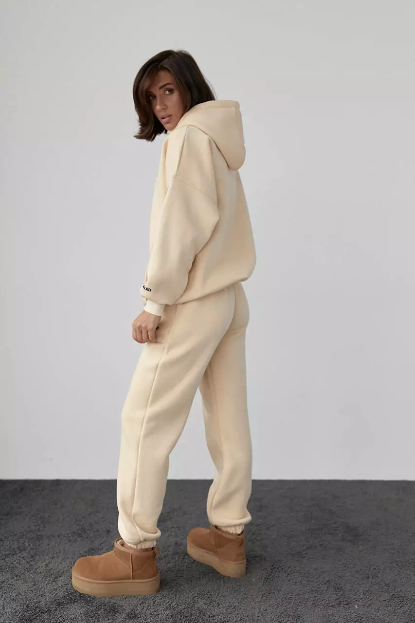 Теплый трикотажный костюм с худи и джоггерами - бежевый цвет, L (есть размеры)