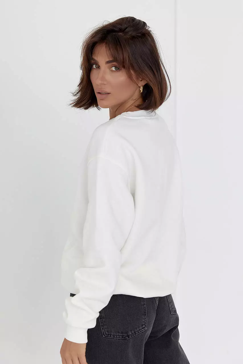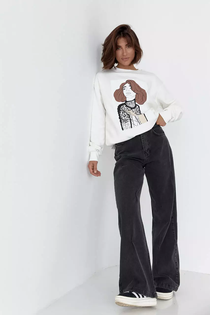 В этой модели спереди нанесен принтованный прямоугольник на котором изображена девушка. Сам свитшот идет с прямым низом, круглой горловиной с окантовкой и опущенными проймами. Длинные рукава и низ изделия обшиты трикотажными манжетами.