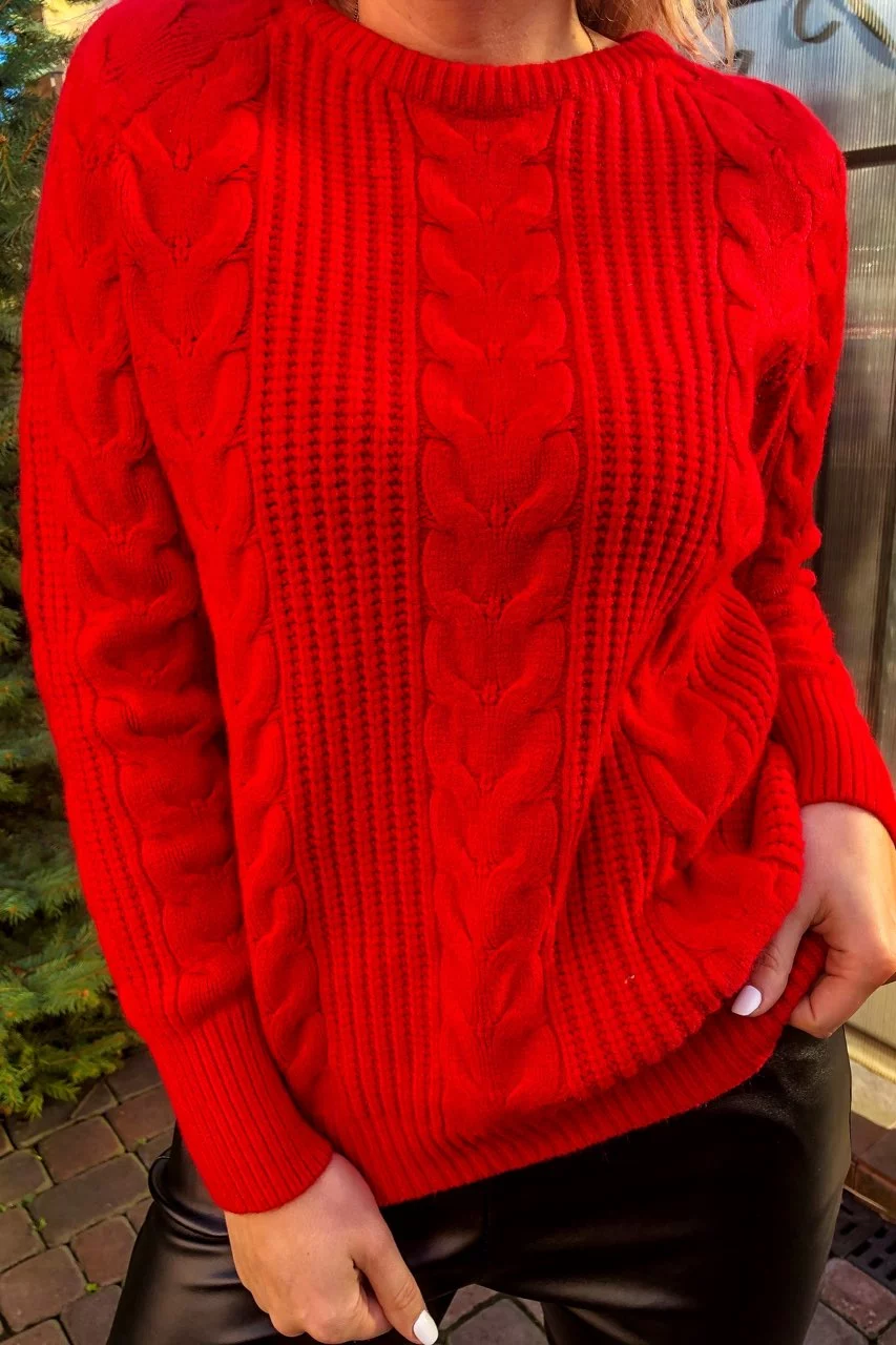 Трендовый свитер с косами фасона oversize - красный цвет, XXL/XXXL