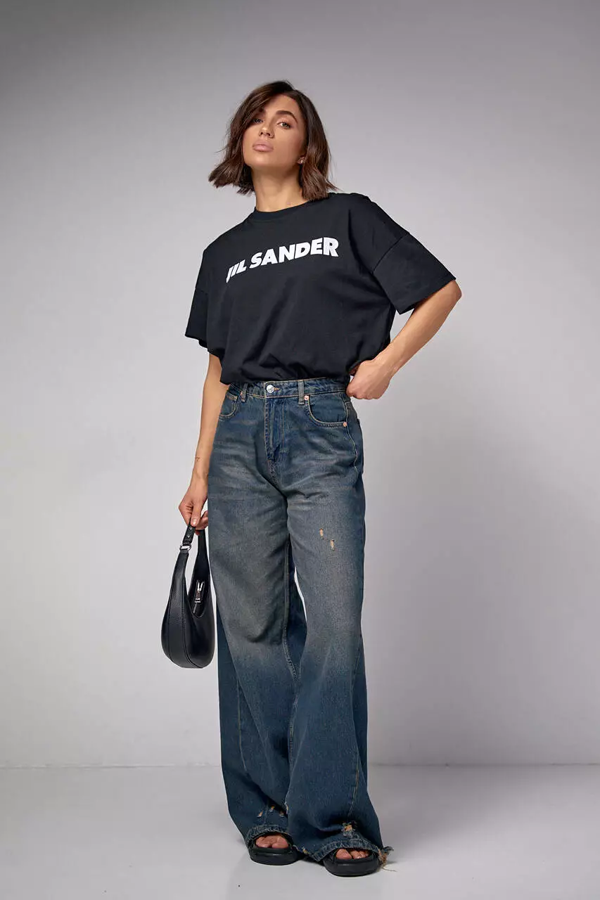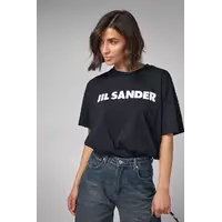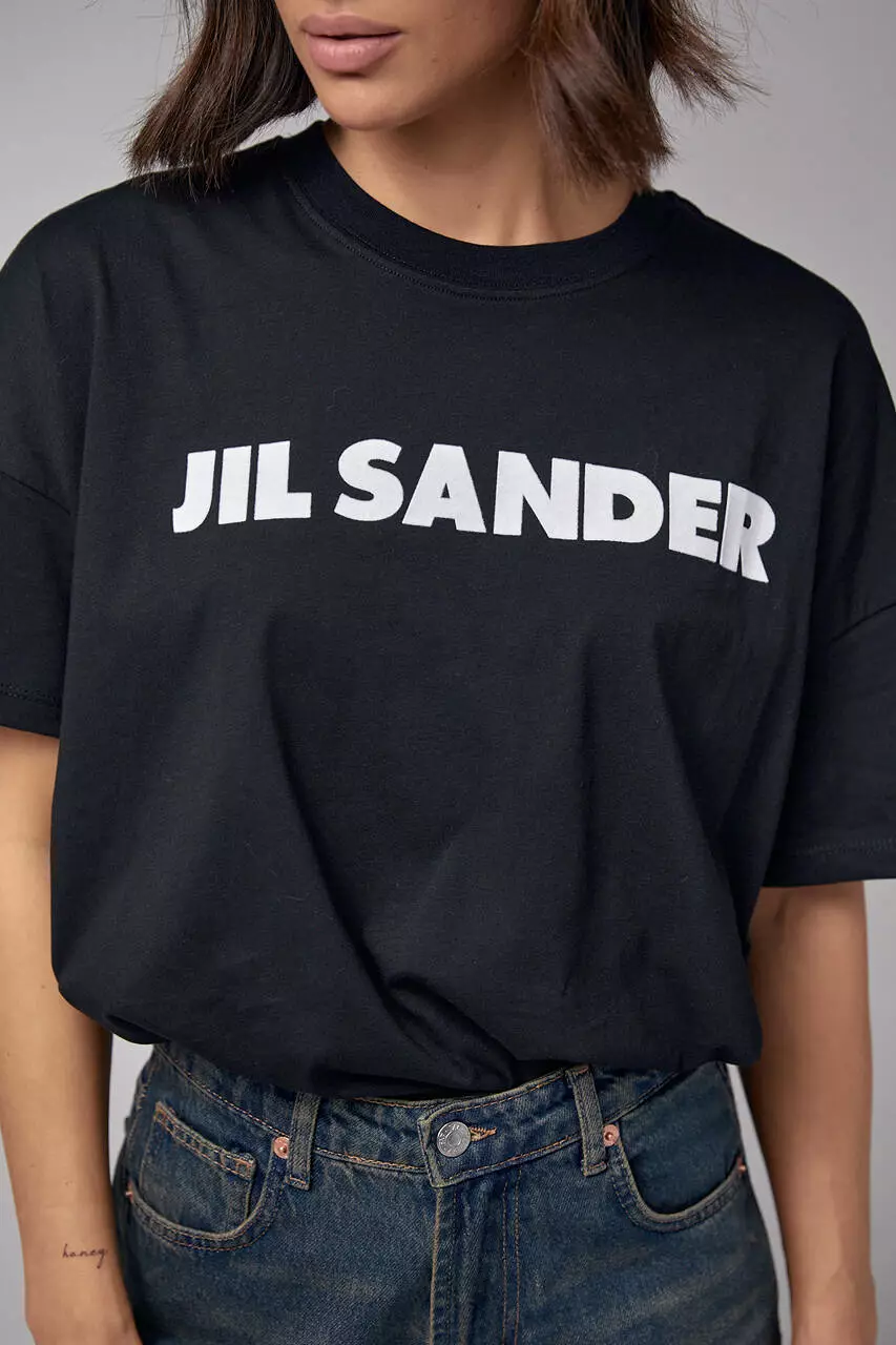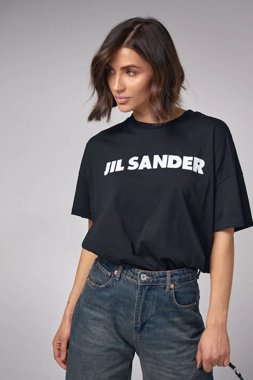 Эта модель спереди украшена надписью Jil Sander. Края низа в изделии прямые, рукава короткие, а круглая горловина обшита бейкой в тон.