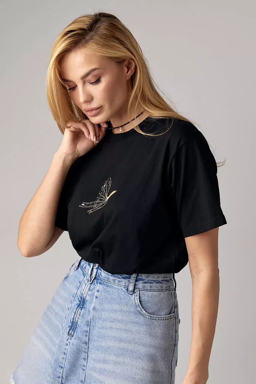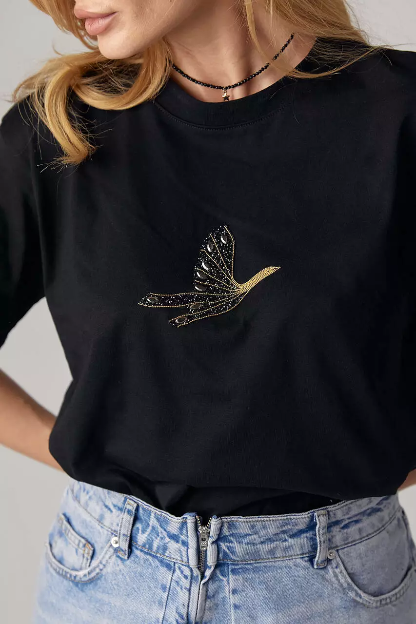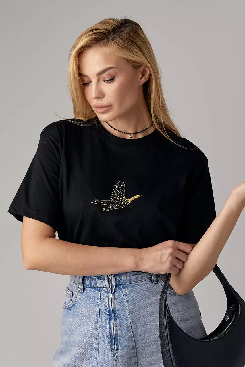 Трикотажная футболка прямого кроя – это удобный и стильный элемент гардероба. Спереди она украшена лаконичной деталью в виде птицы, выполненной из страз и металлических цепочек.