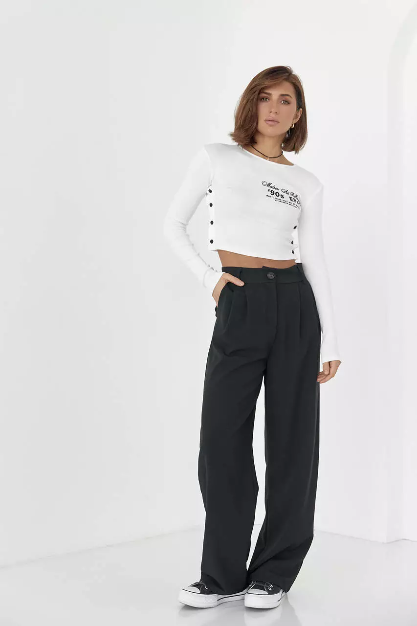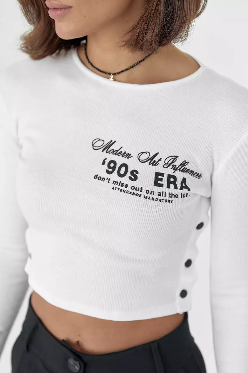 Круглая горловина обшита окантовкой и спереди, на груди, кофточка украшена буквенным принтом.