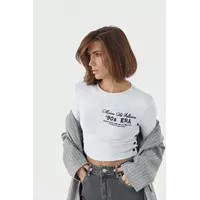 Круглая горловина обшита окантовкой и спереди, на груди, кофточка украшена буквенным принтом.