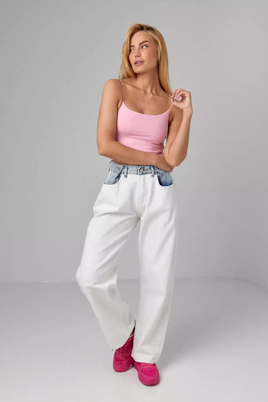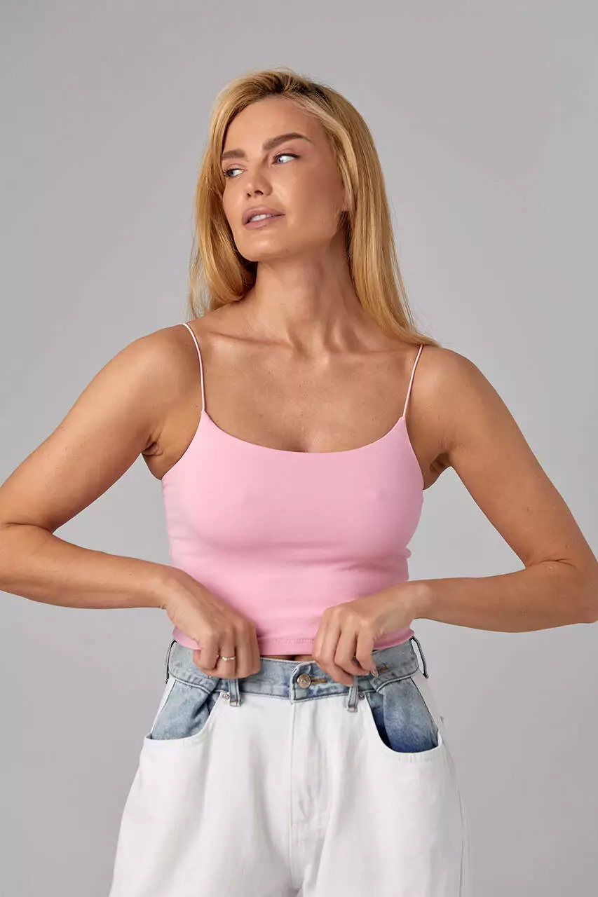 Пополните свой шкаф универсальной майкой на тонких бретелях-резинках приталенного фасона. В линейке представлены базовые цвета.