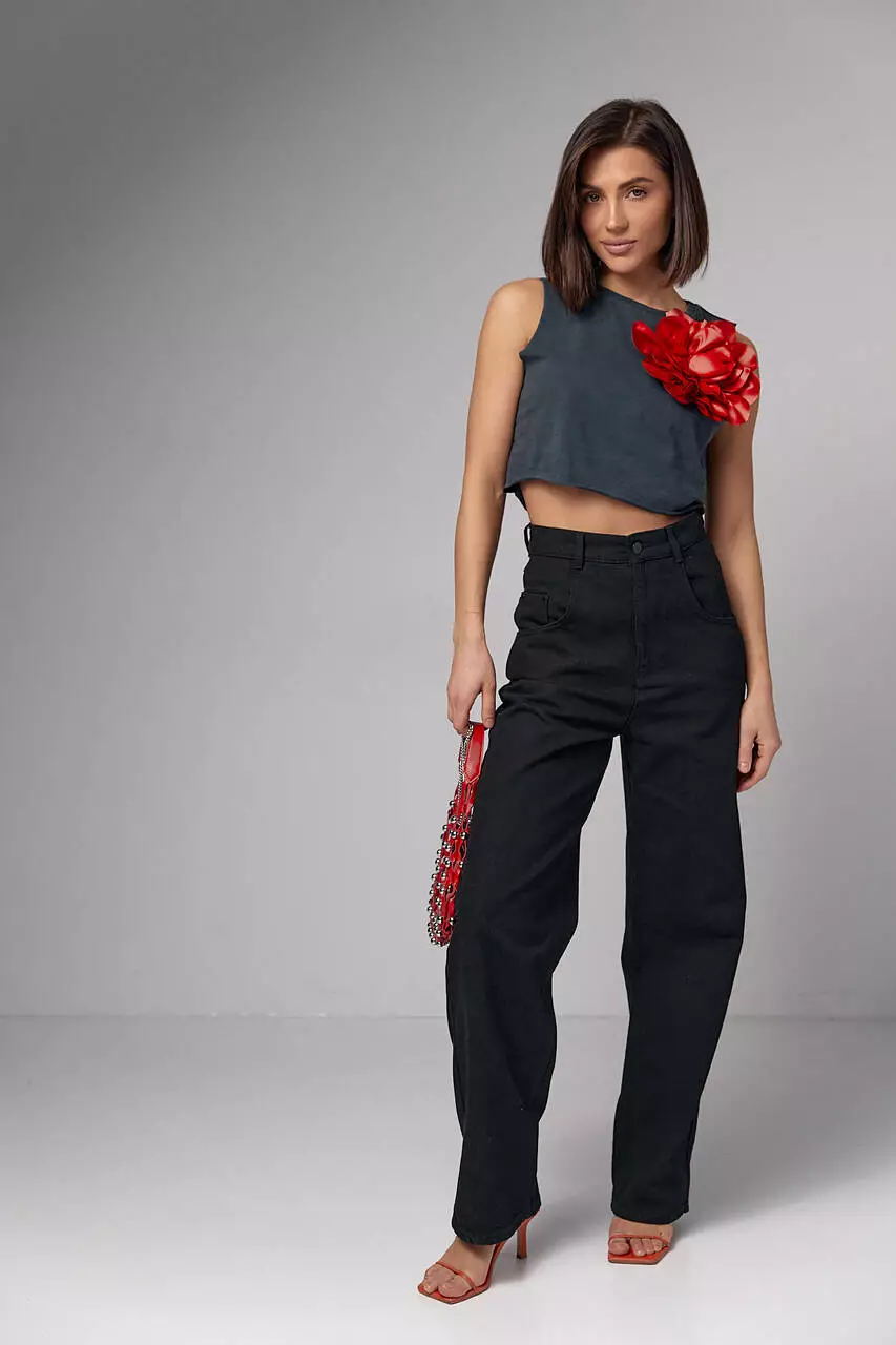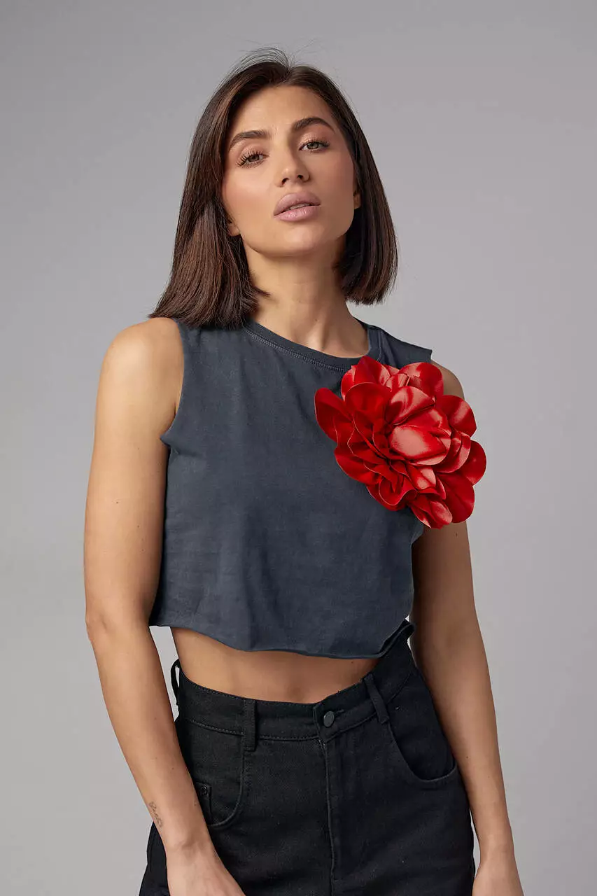 Трикотажная майка-топ с объемным цветком - темно-серый цвет, L (есть размеры)