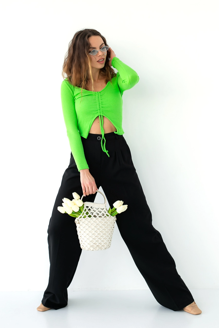 шнурками. С их помощью можно стягивать кофту, регулируя ее