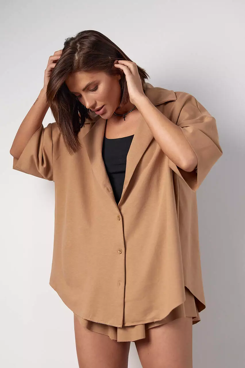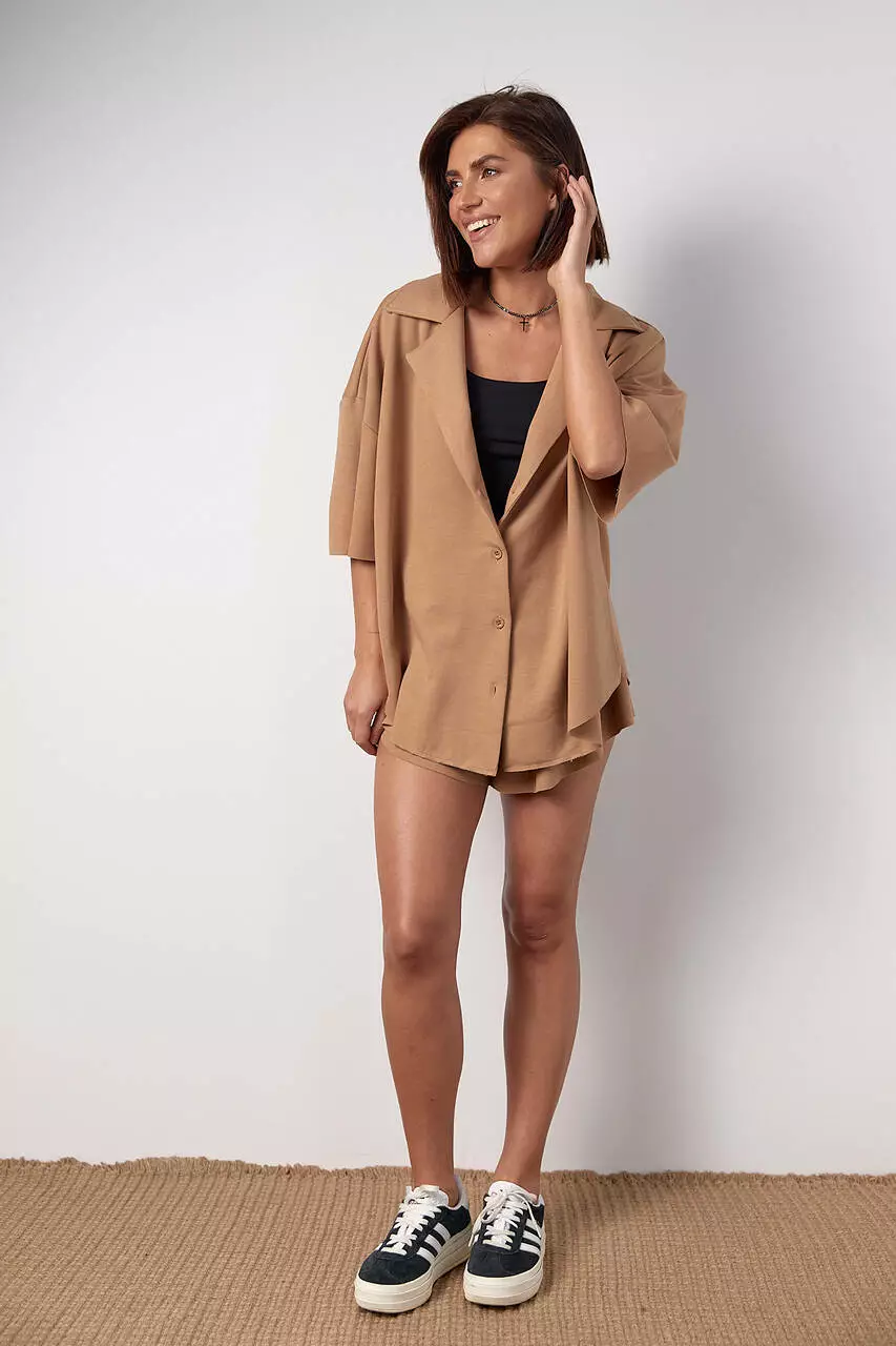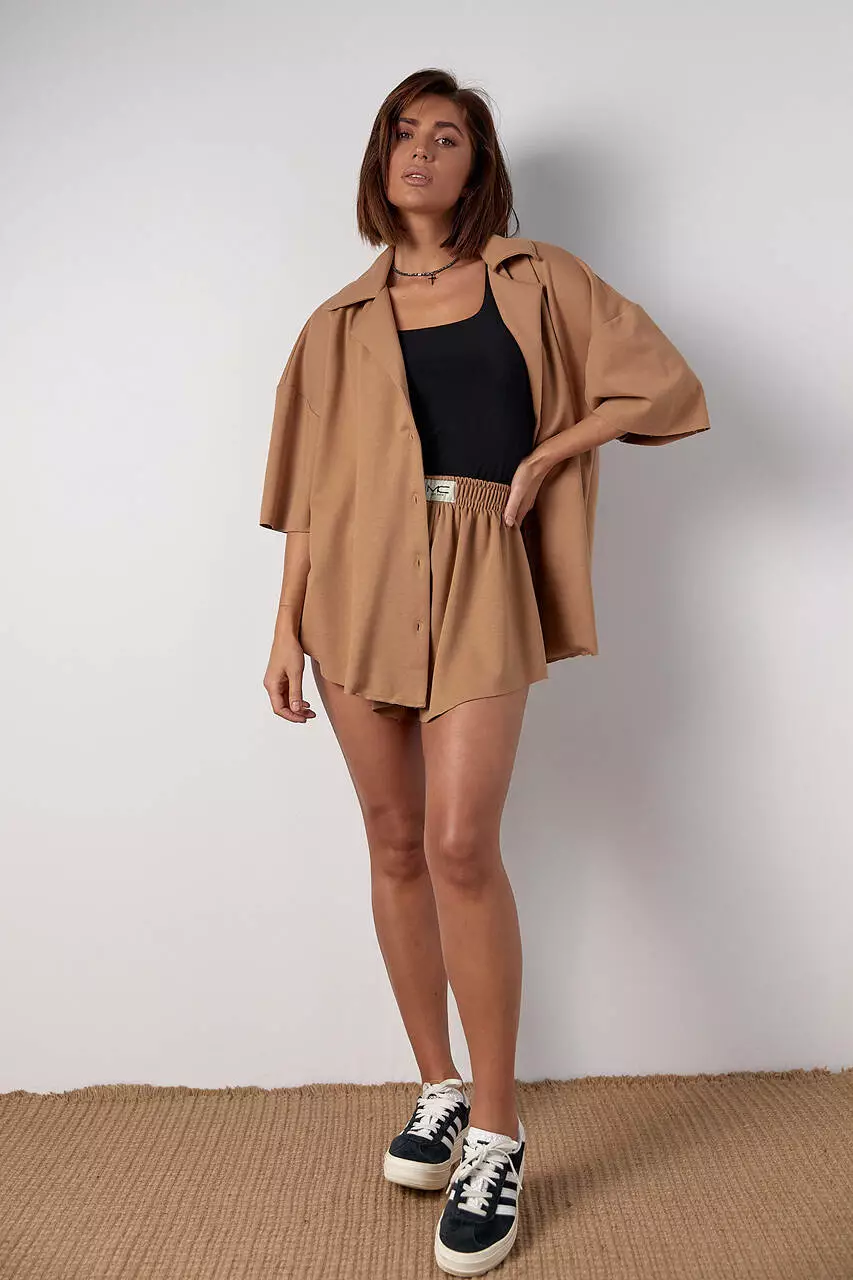 Этот женский трикотажный костюм - это идеальный вариант для комфортного и стильного образа. В его состав входит оверсайз рубашка на пуговицах с отложным воротником и закругленным низом, а также шорты-юбка клеш на резинке.