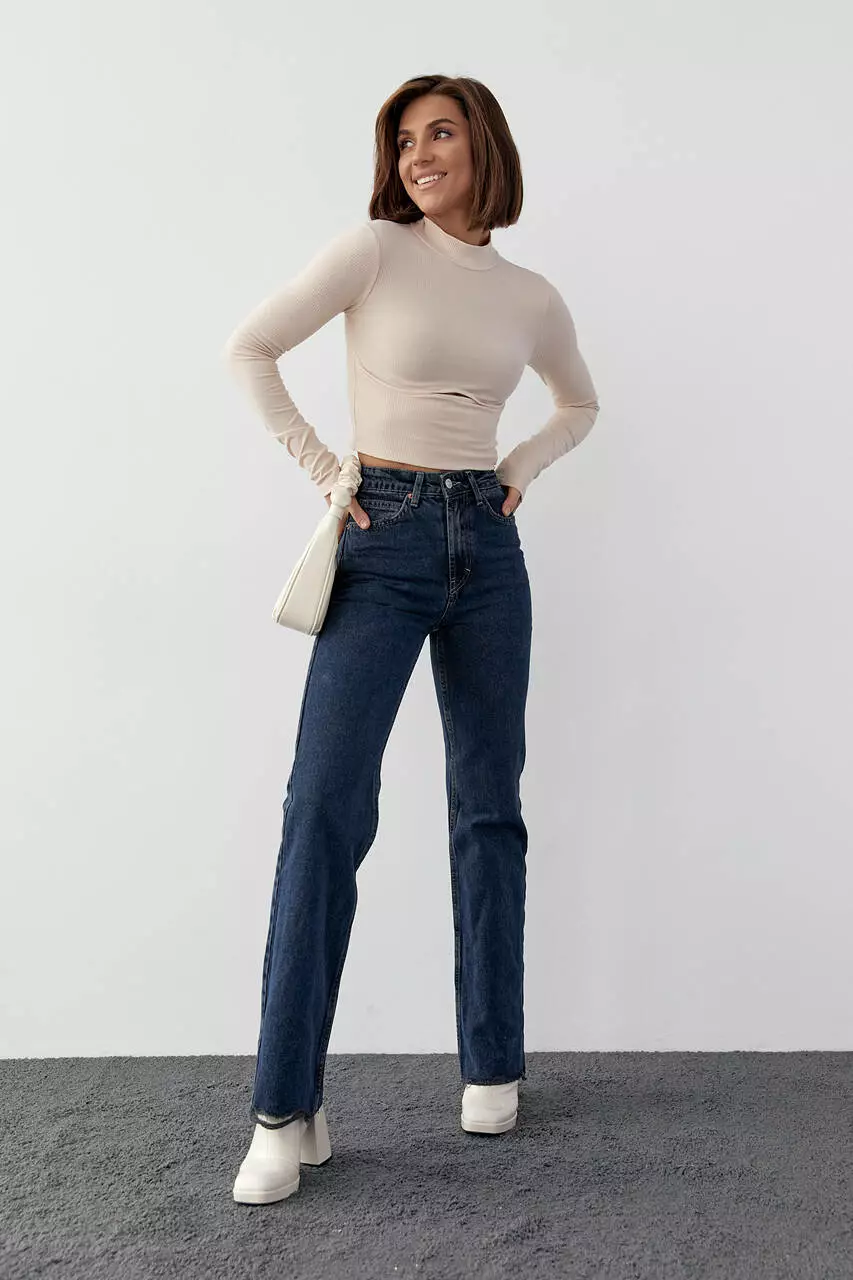 В модели края низа прямые, рукава длинные, круглая горловина