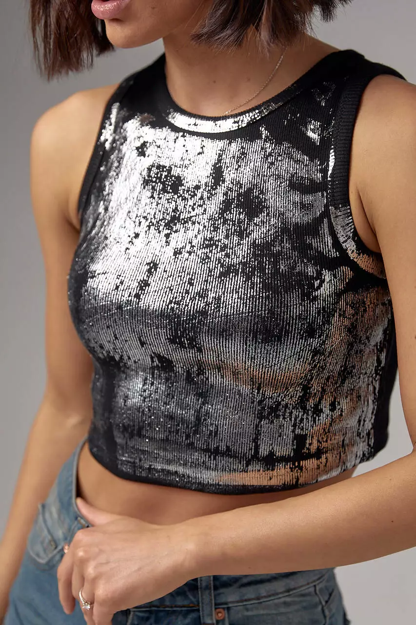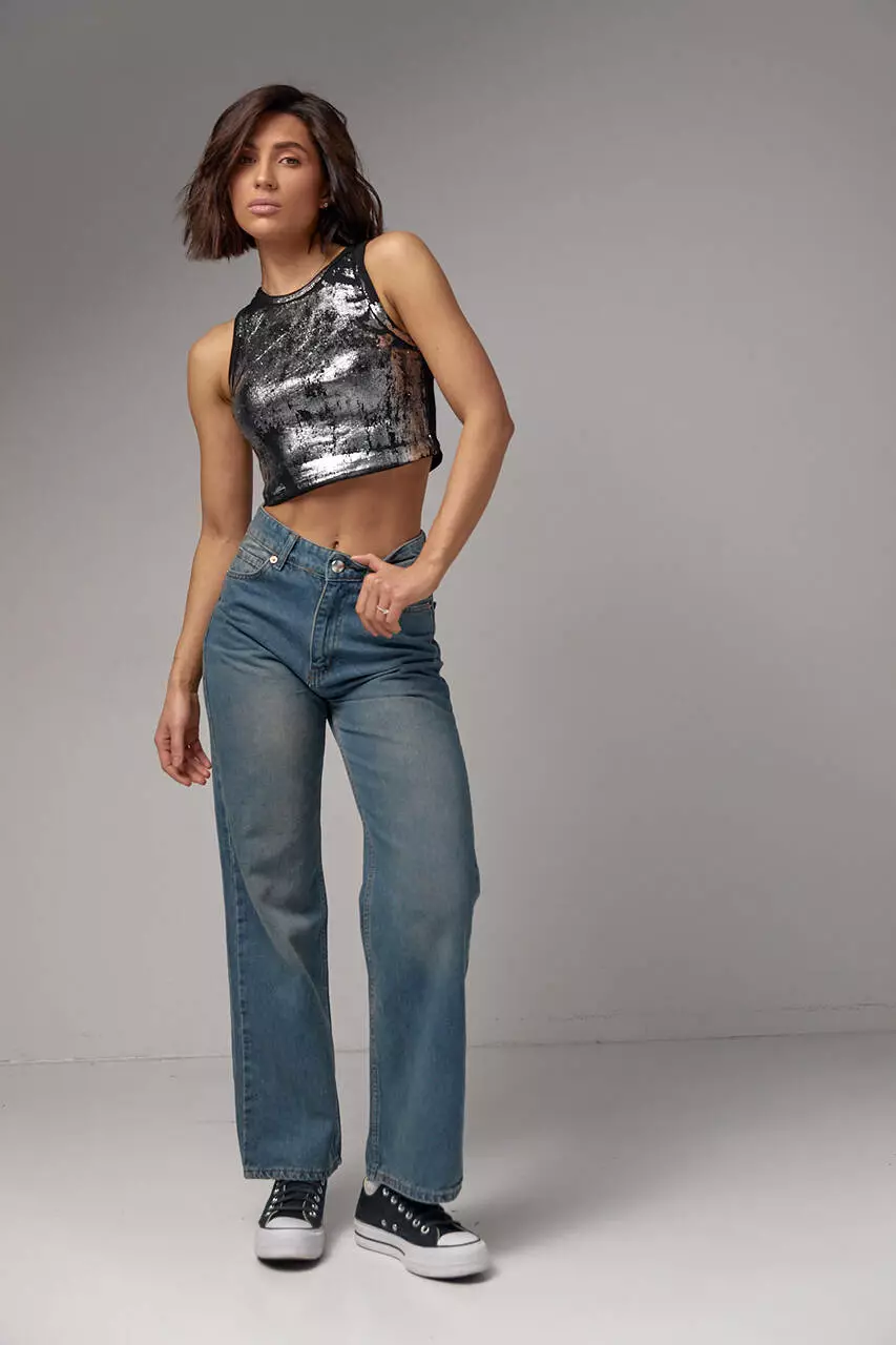 С таким коротким женским топом твои базовые наряды получат новые акценты. Его секрет - в стильном блестящем напыление и трендовом фасоне с круглой горловиной.