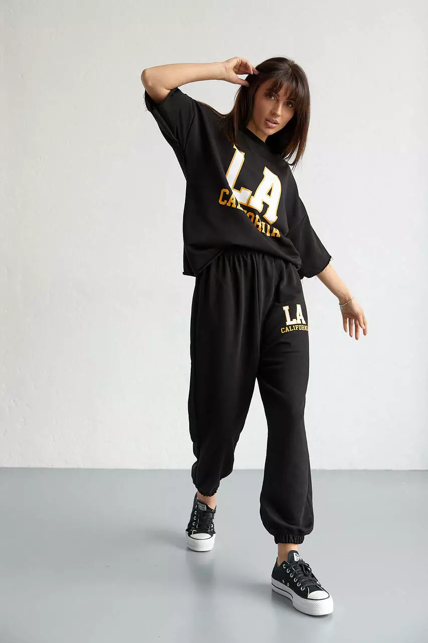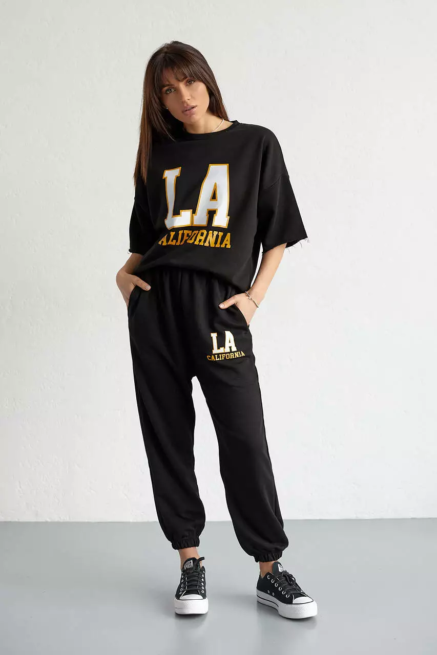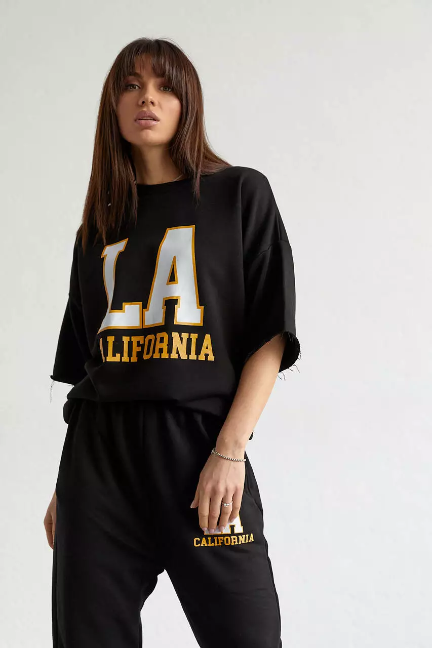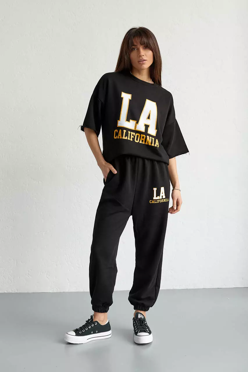 В этом комплекте свитшот в стиле оверсайз украшен спереди принтом La California. В изделии края низа прямые, без манжетов.