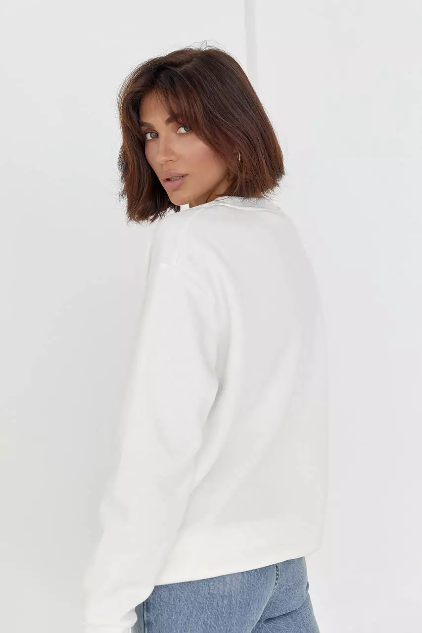 В модели длинные рукава и прямой низ идут с манжетами, а круглая