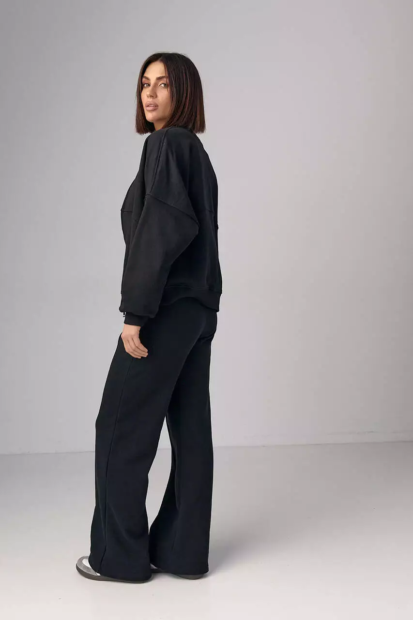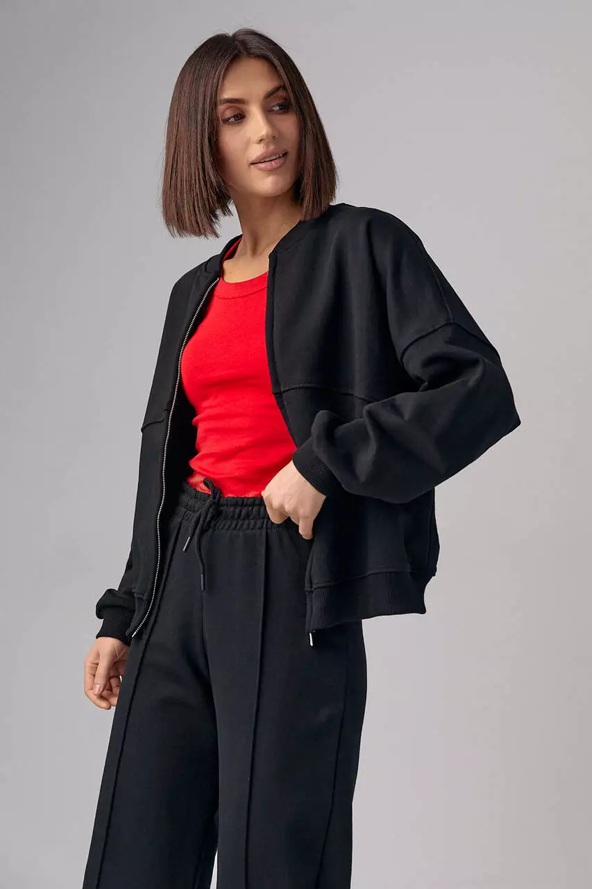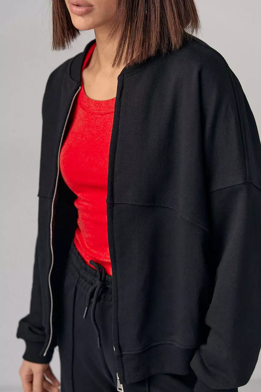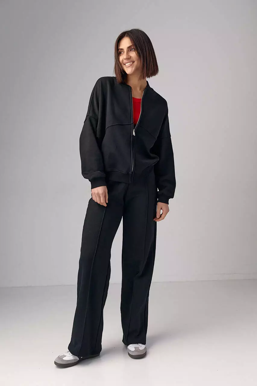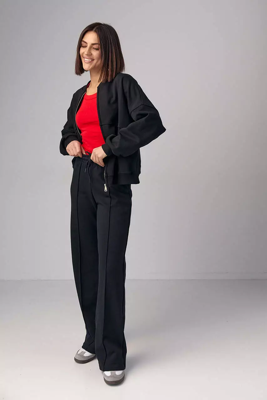 Трикотажный женский костюм с бомбером и прямыми штанами - черный цвет, L (есть размеры)