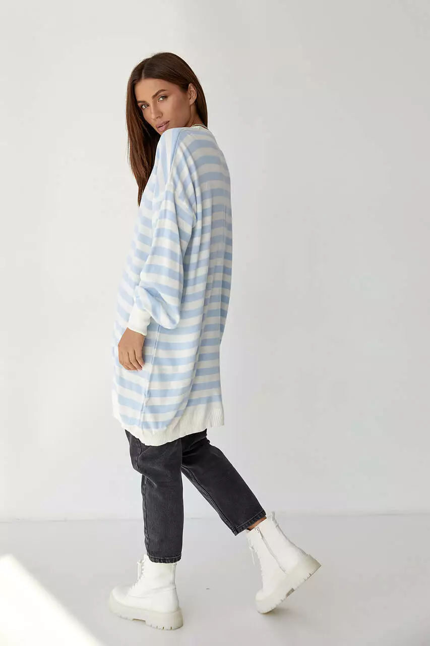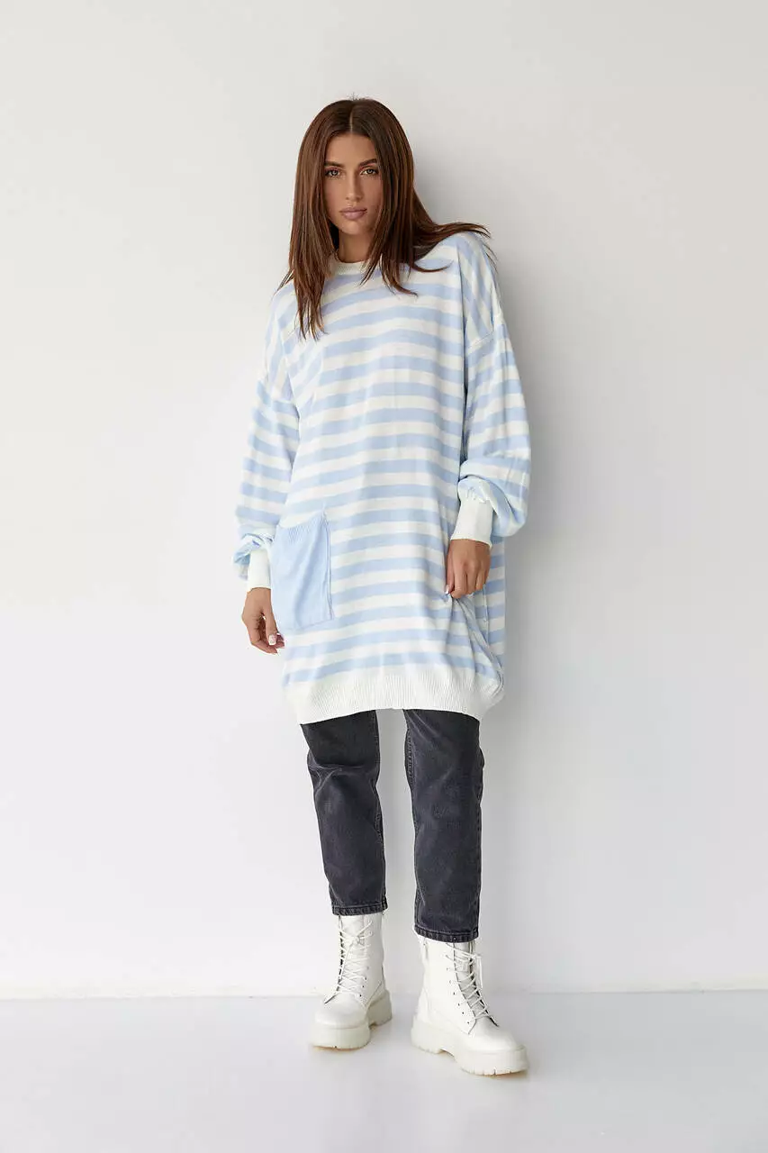 Эта модель в стиле оверсайз полностью украшена полоской, а внизу дополнена однотонным карманом.