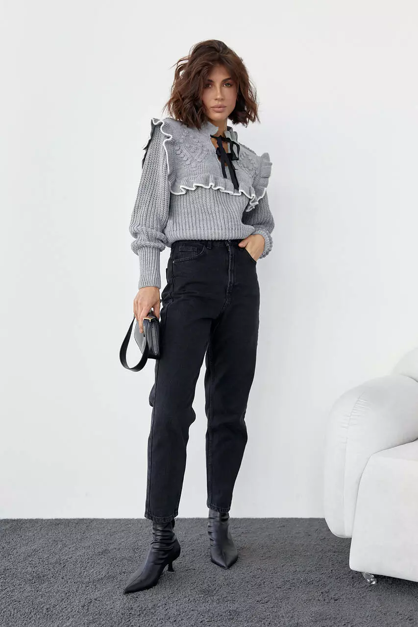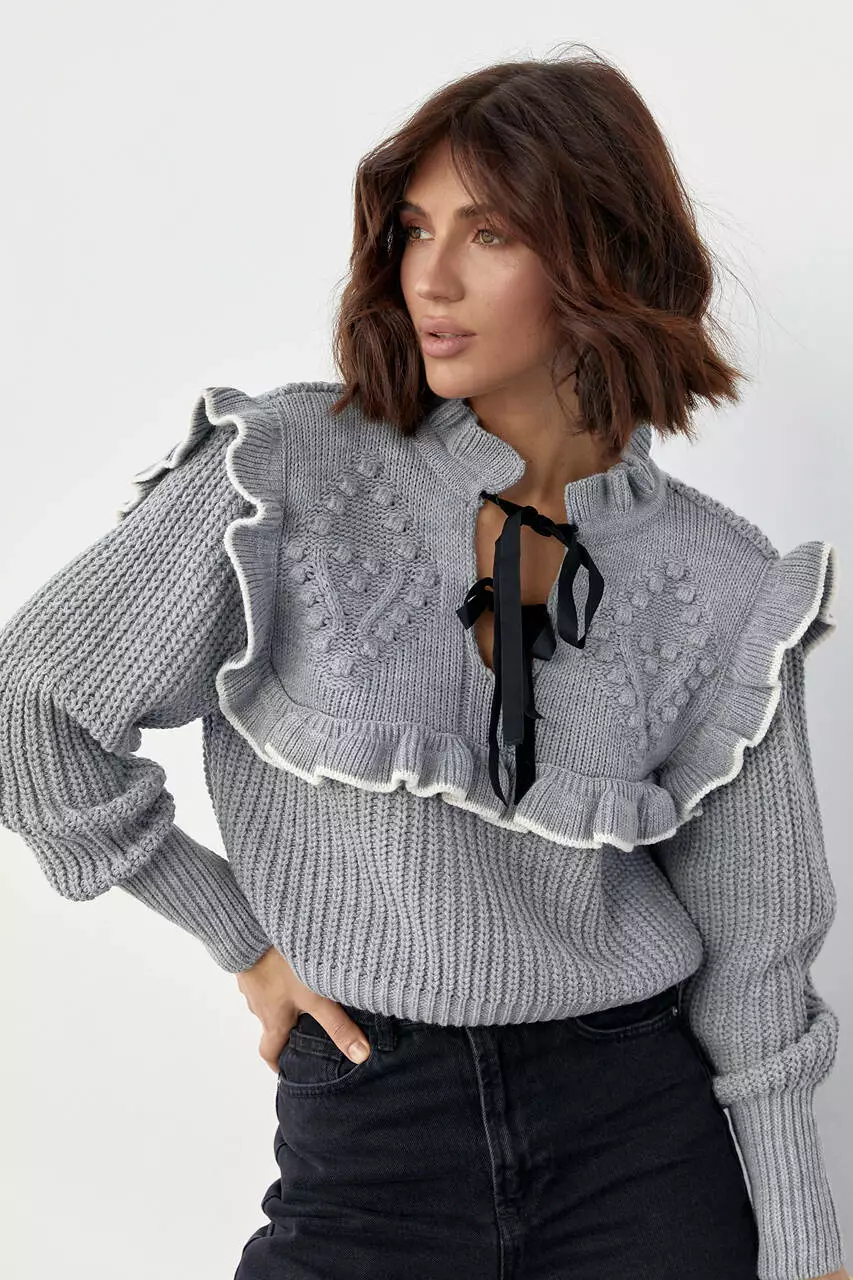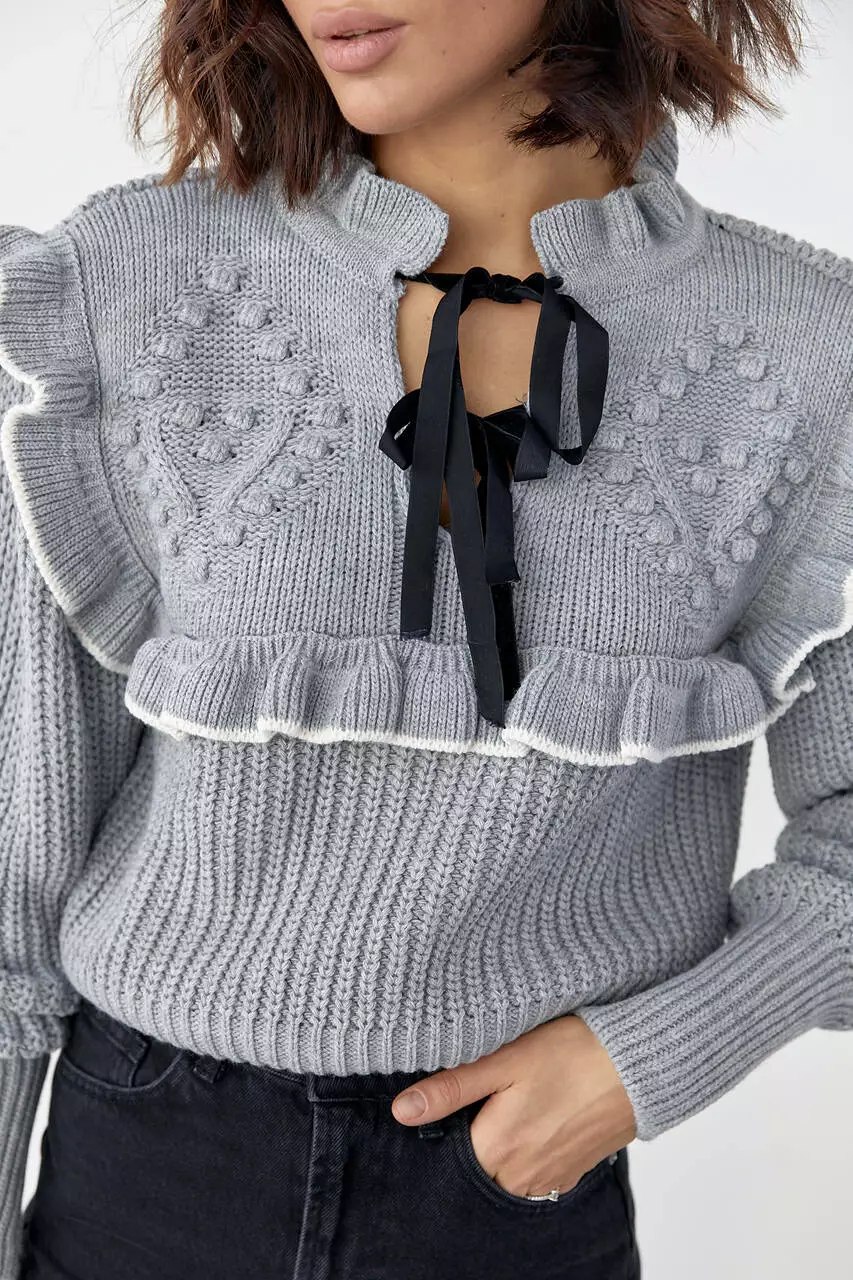 Укороченная вязаная кофта с рюшами и завязками - серый цвет, L (есть размеры)