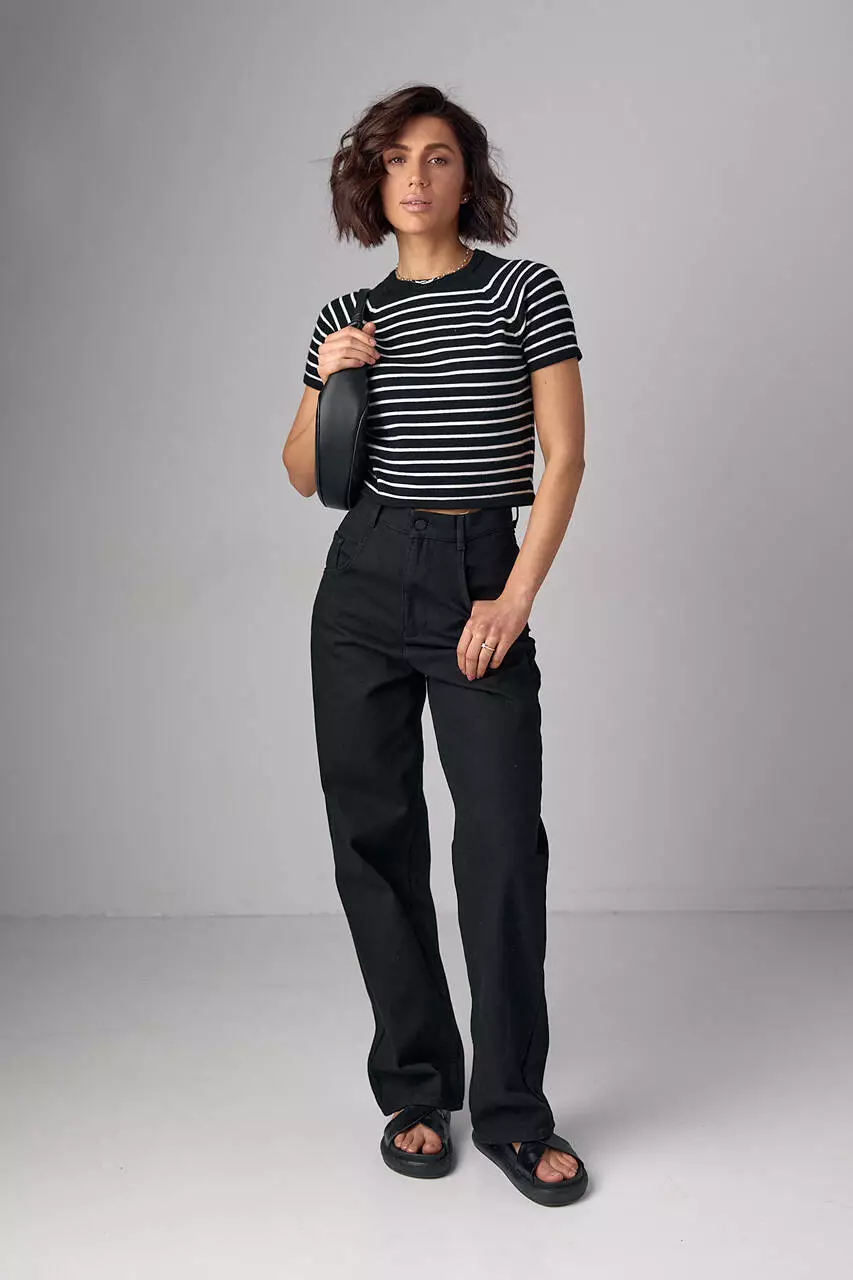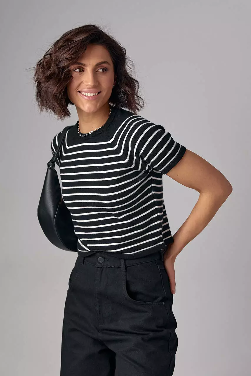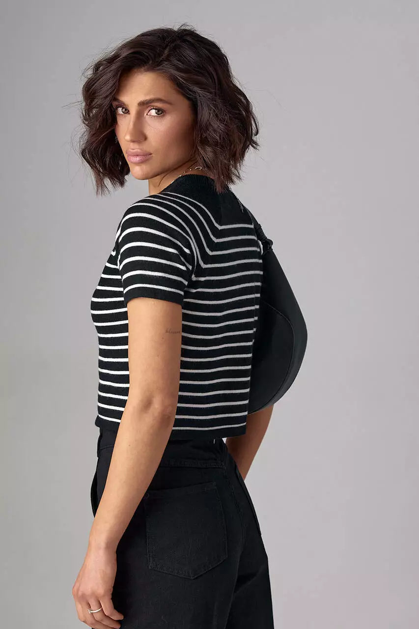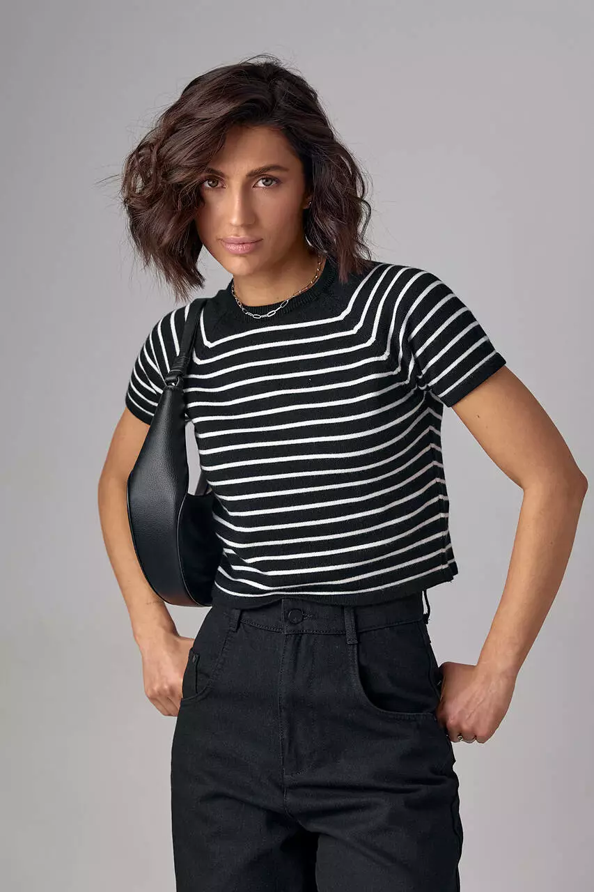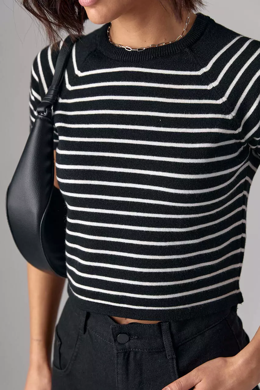 Эта модель подчеркивает красоту женской фигуры благодаря укороченному фасону и расставляет финальные акценты благодаря узким горизонтальным полоскам контрастного цвета. В изделии края низа прямые, рукава-регланы короткие, а круглая горловина обшита однотонной бейкой в цвет фона.