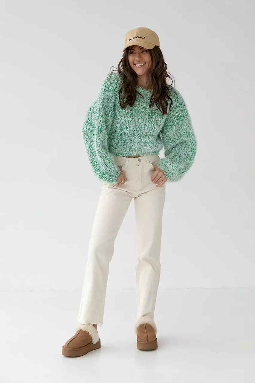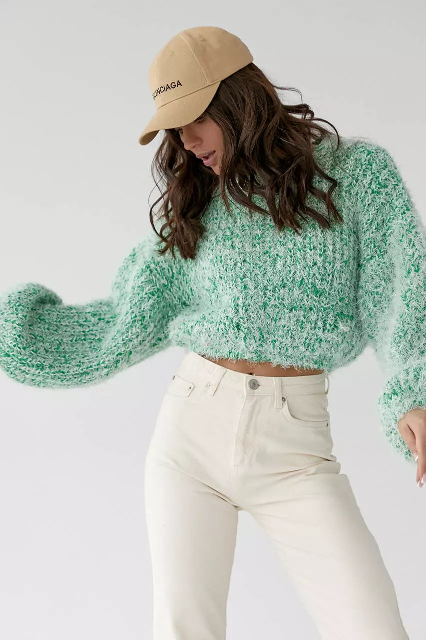 Модель имеет укороченный фасон и выполнена из пряжи, которая напоминает траву.