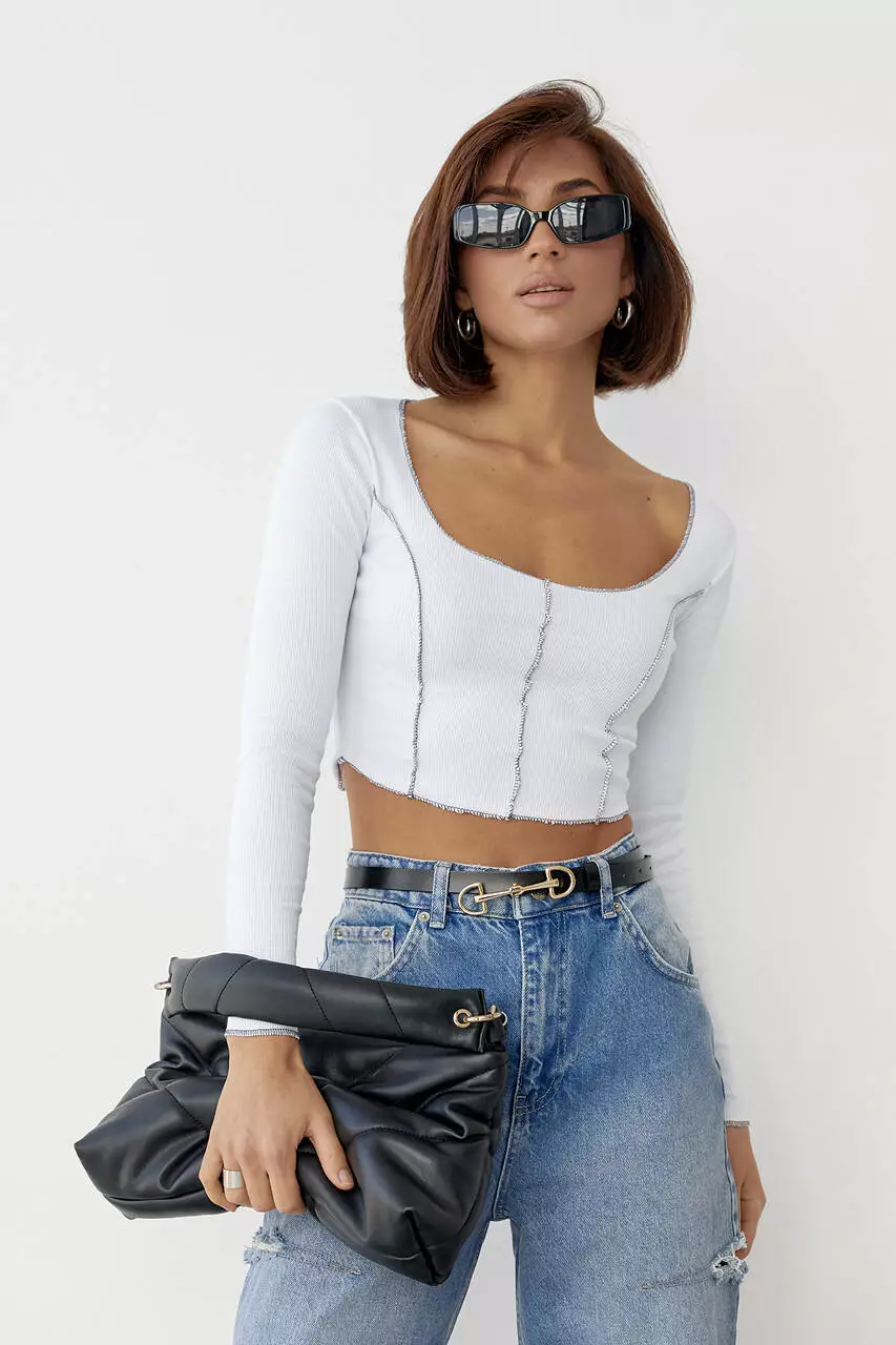 Укороченный джемпер в рубчик со швами наружу - молочный цвет, M (есть размеры)