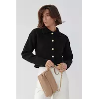 Модель идет с опущенными проймами и круглой горловиной с отложным воротником. Фасон укороченный.