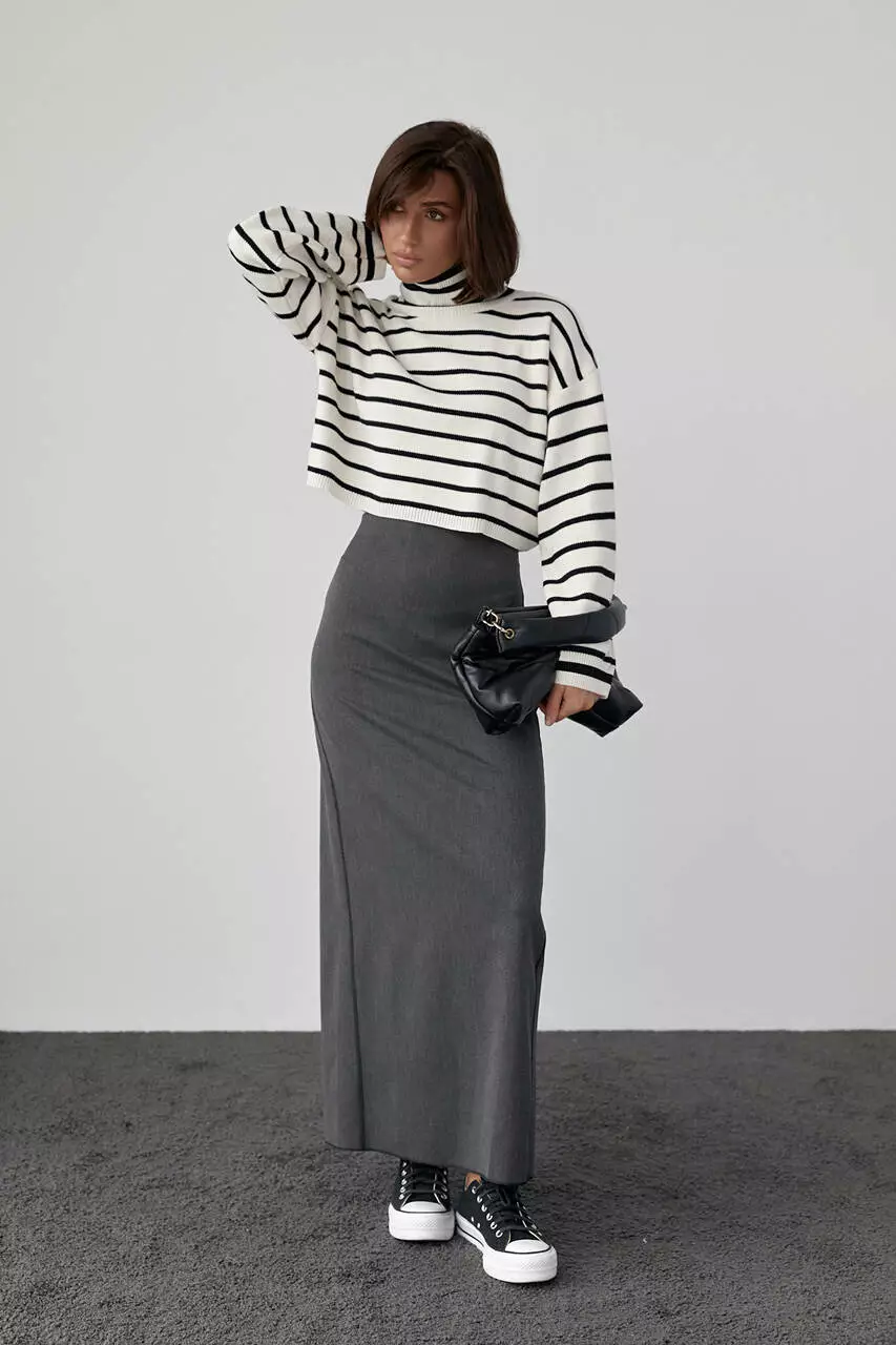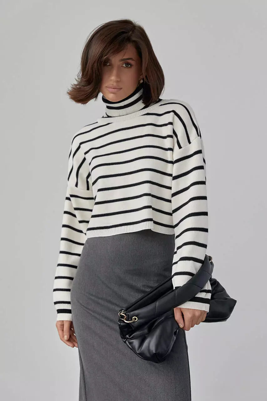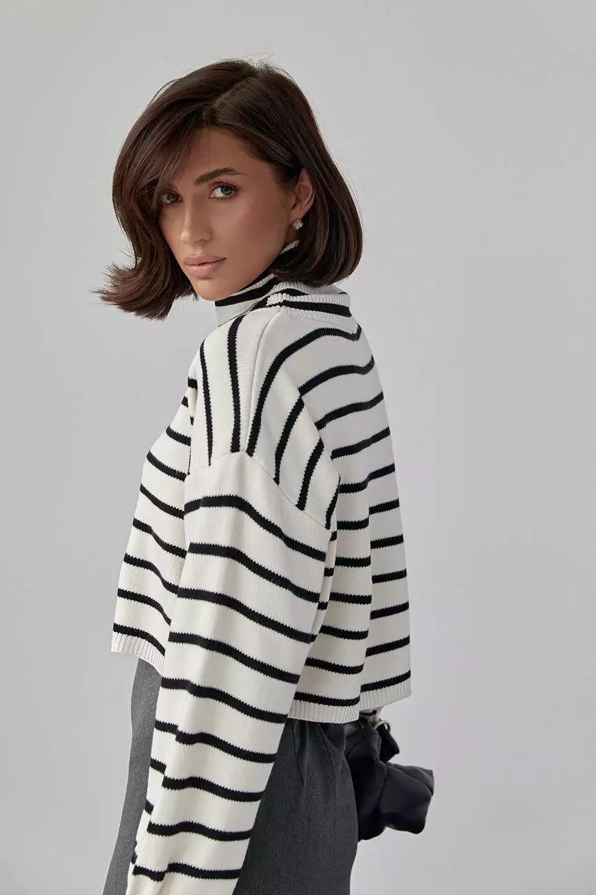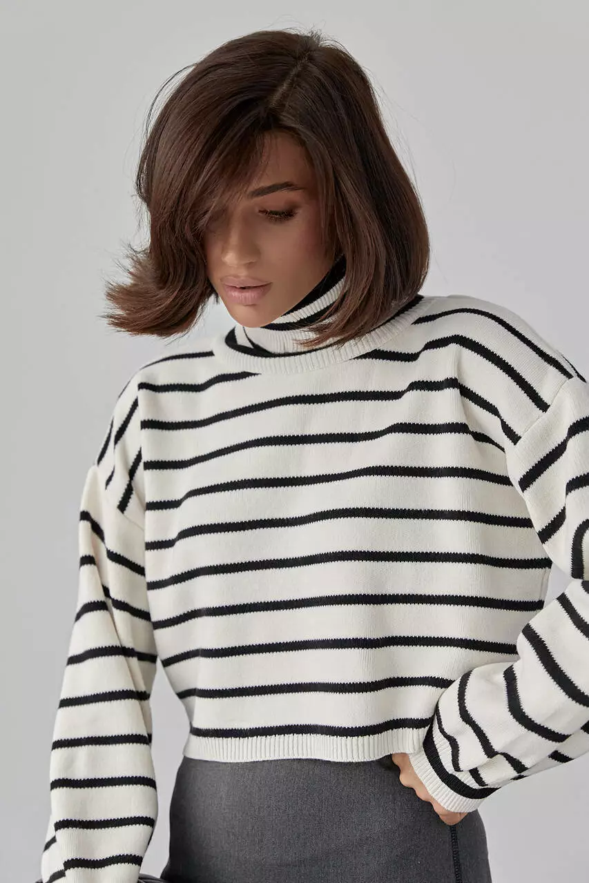 полоску. В кофточке высокий воротник заворачивается вдвое, прямой