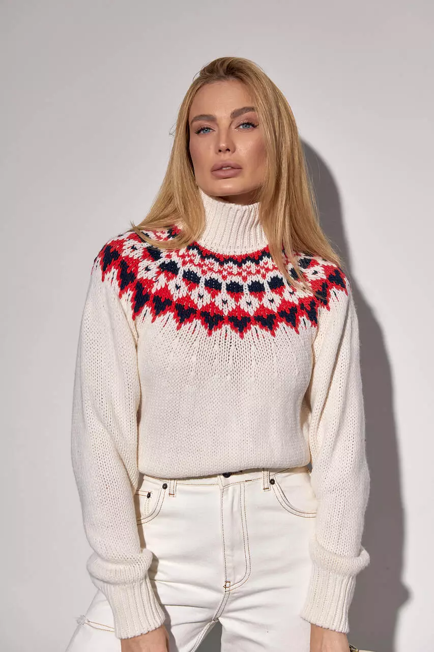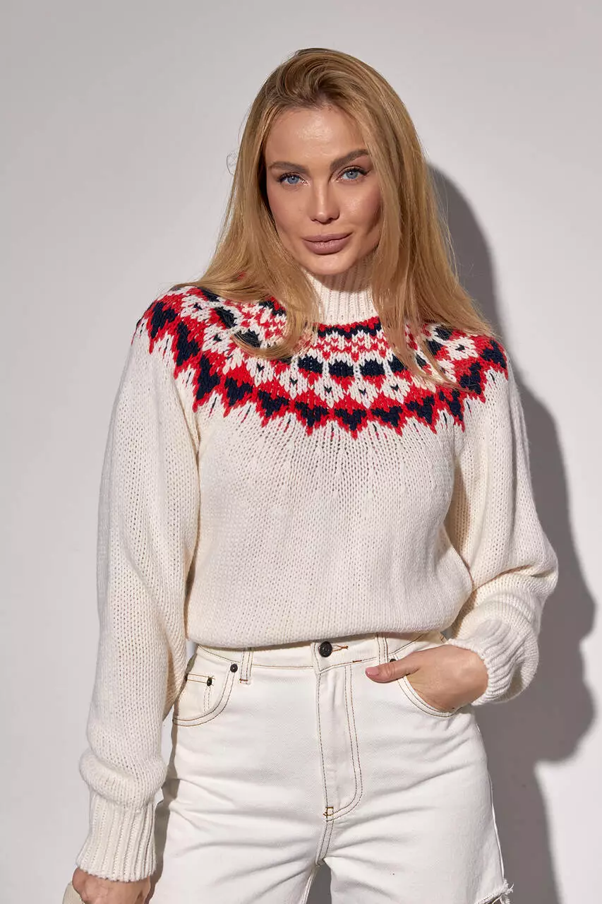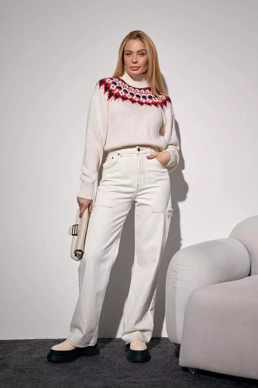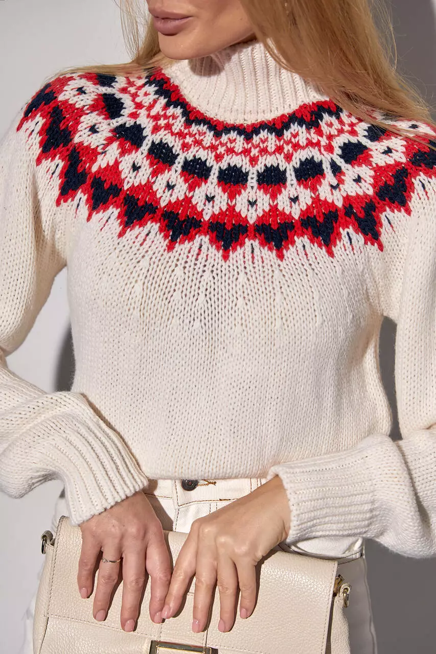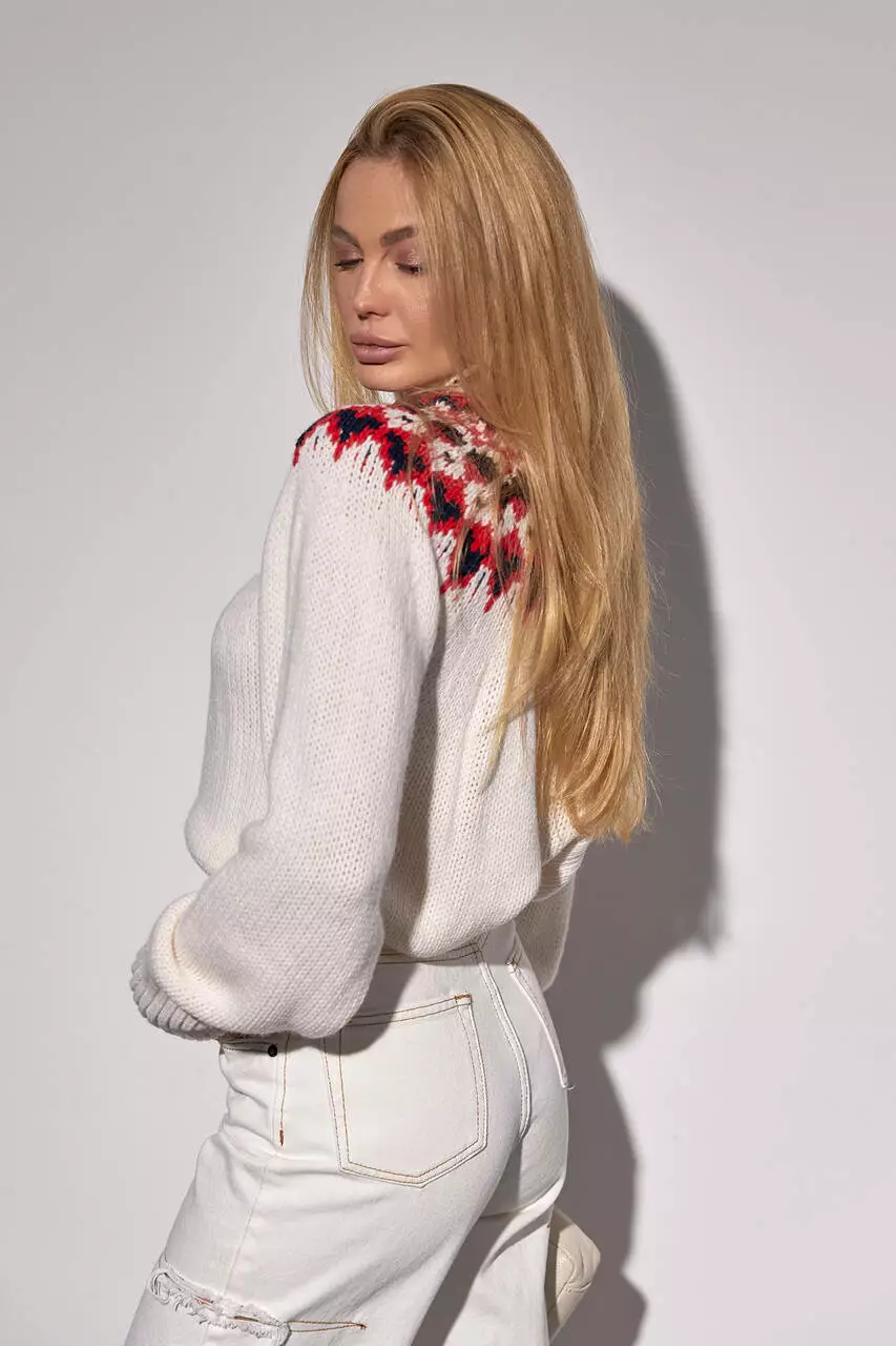 также на спинке, украшена трендовым орнаментом. Круглая горловина