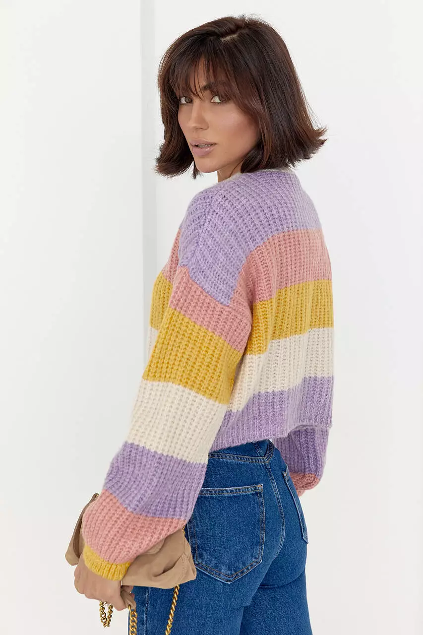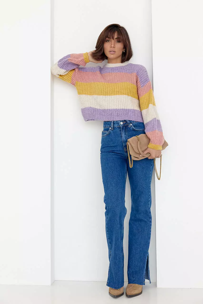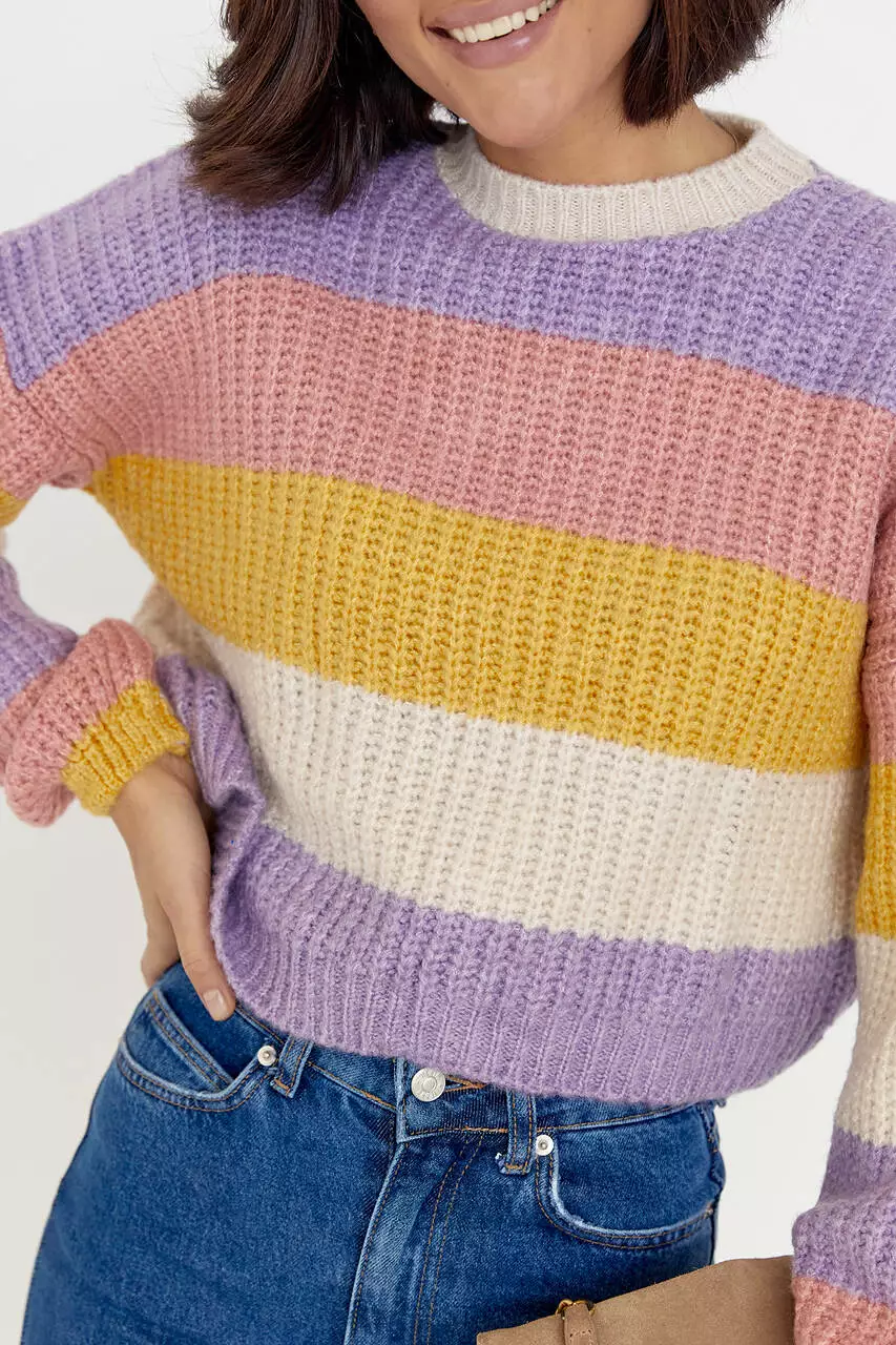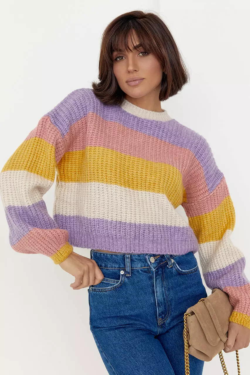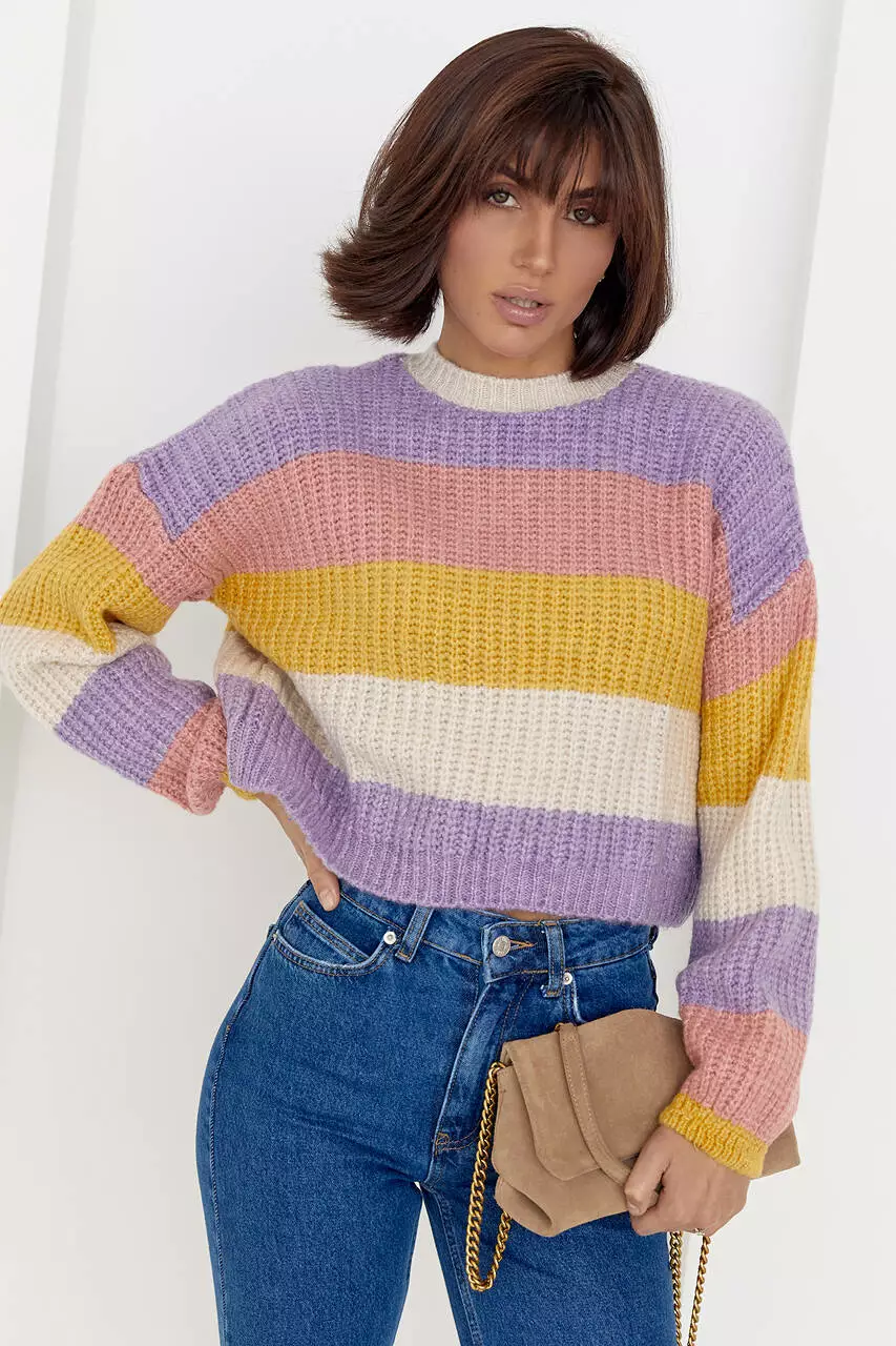 Ищете стильную вязаную кофточку под брюки и юбки с высокой талией - выбирайте этот укороченный джемпер из машинной вязки в цветную полоску!