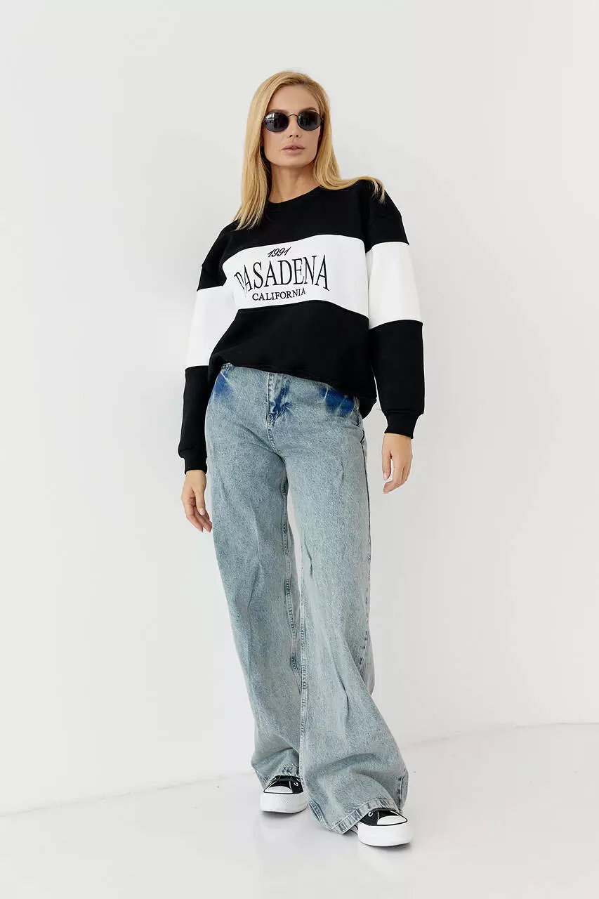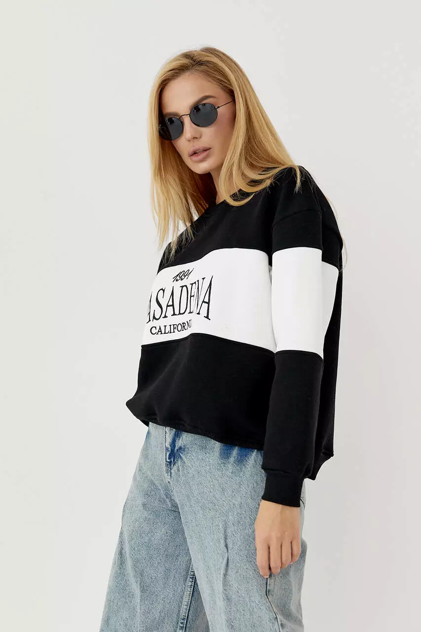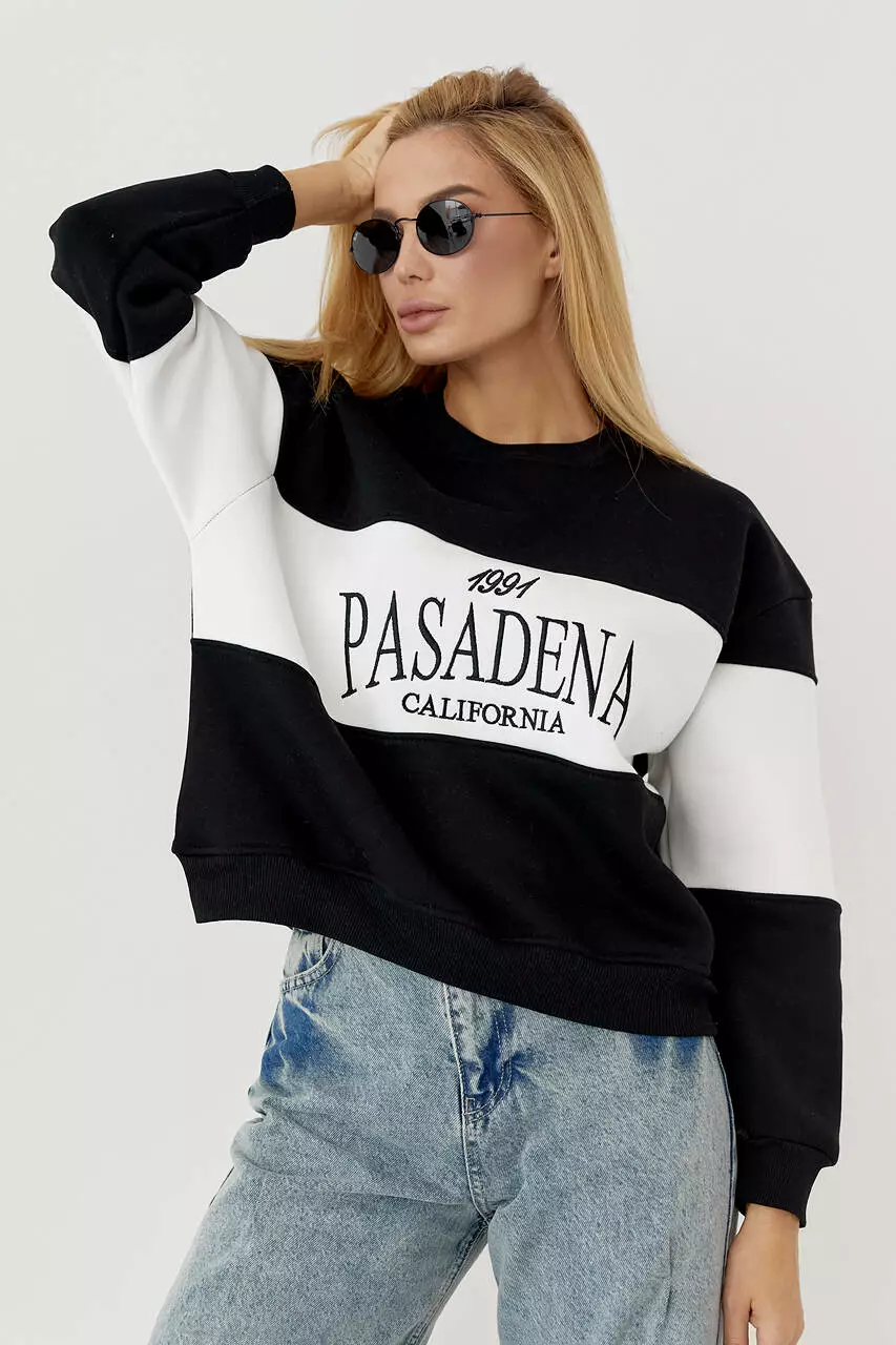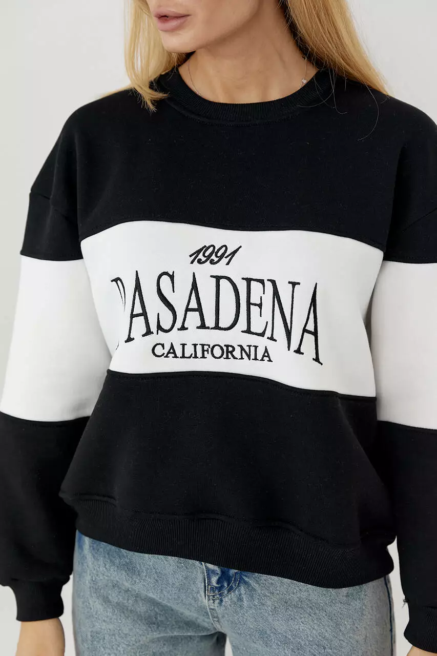 Модель сшита из теплого трикотажа с начесом и спереди по центру изделия, а также на рукавах украшена широкой вставкой контрастного цвета. Также спереди расположена вышитая надпись "1991 PASADENA California".
